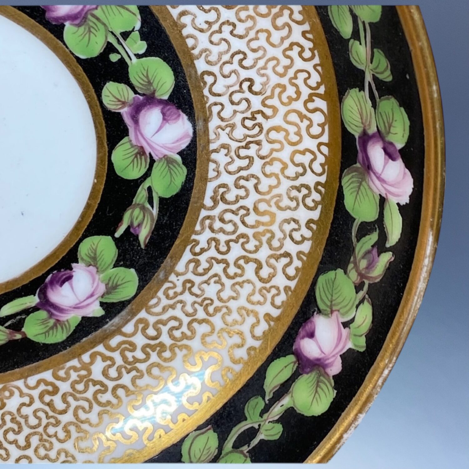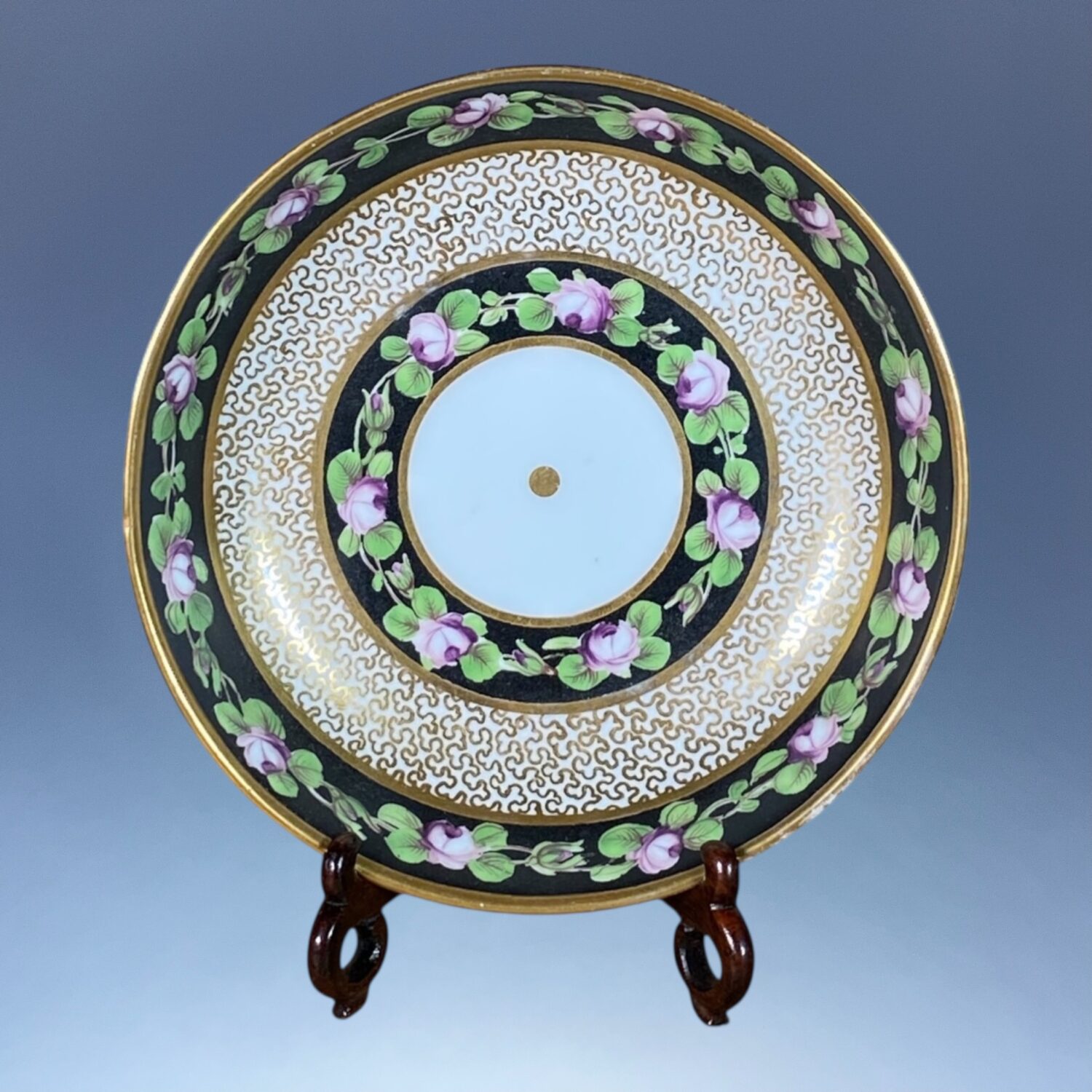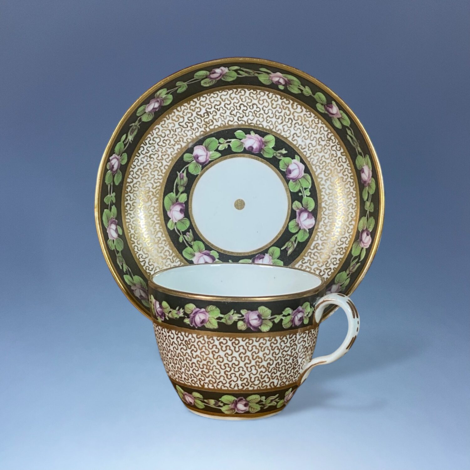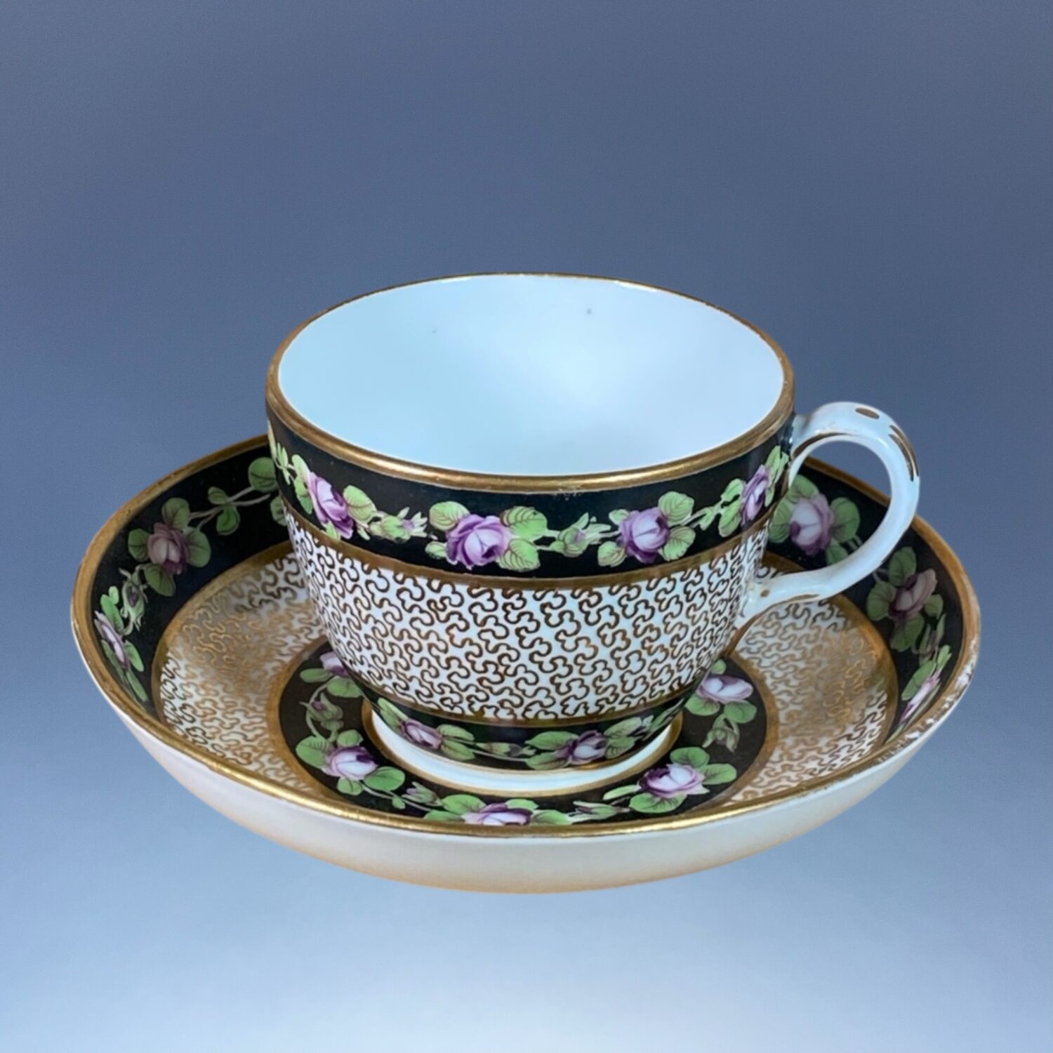 C19th Worcester porcelain ‘bute’ shape teacup & saucer, decorated with bands of hand painted puce coloured flowers against a black ground and a band of ‘vermicelli’ gilding.