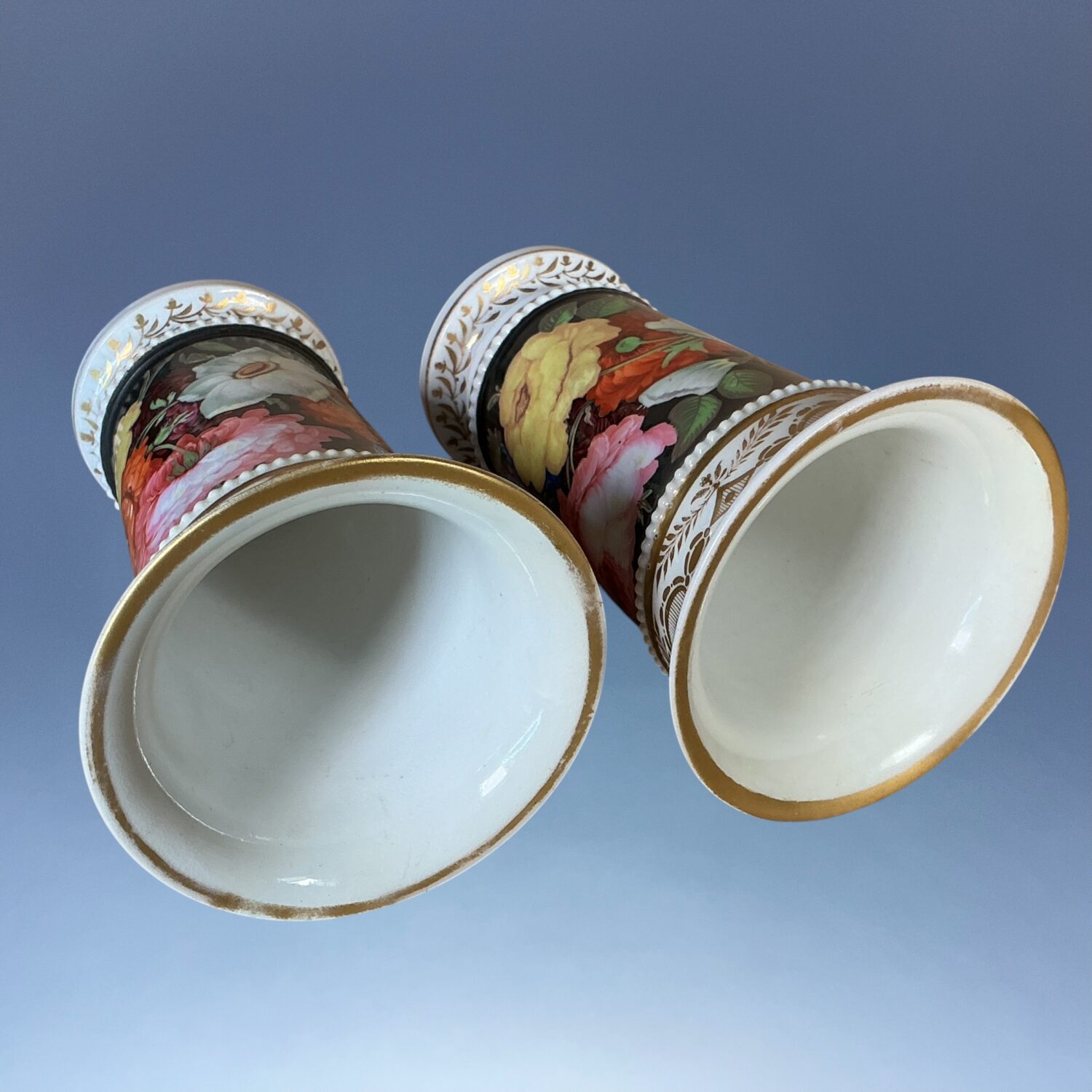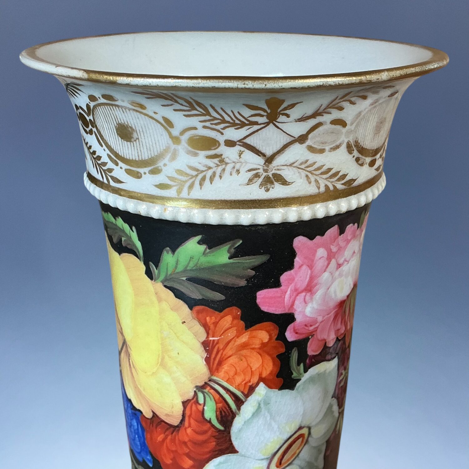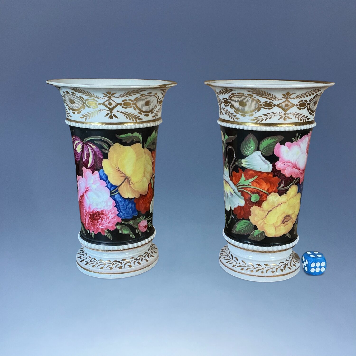 Pair of early 19th century English porcelain flare top spill vases, decorated with hand painted colourful flowers against a black ground with elaborate gilt borders.