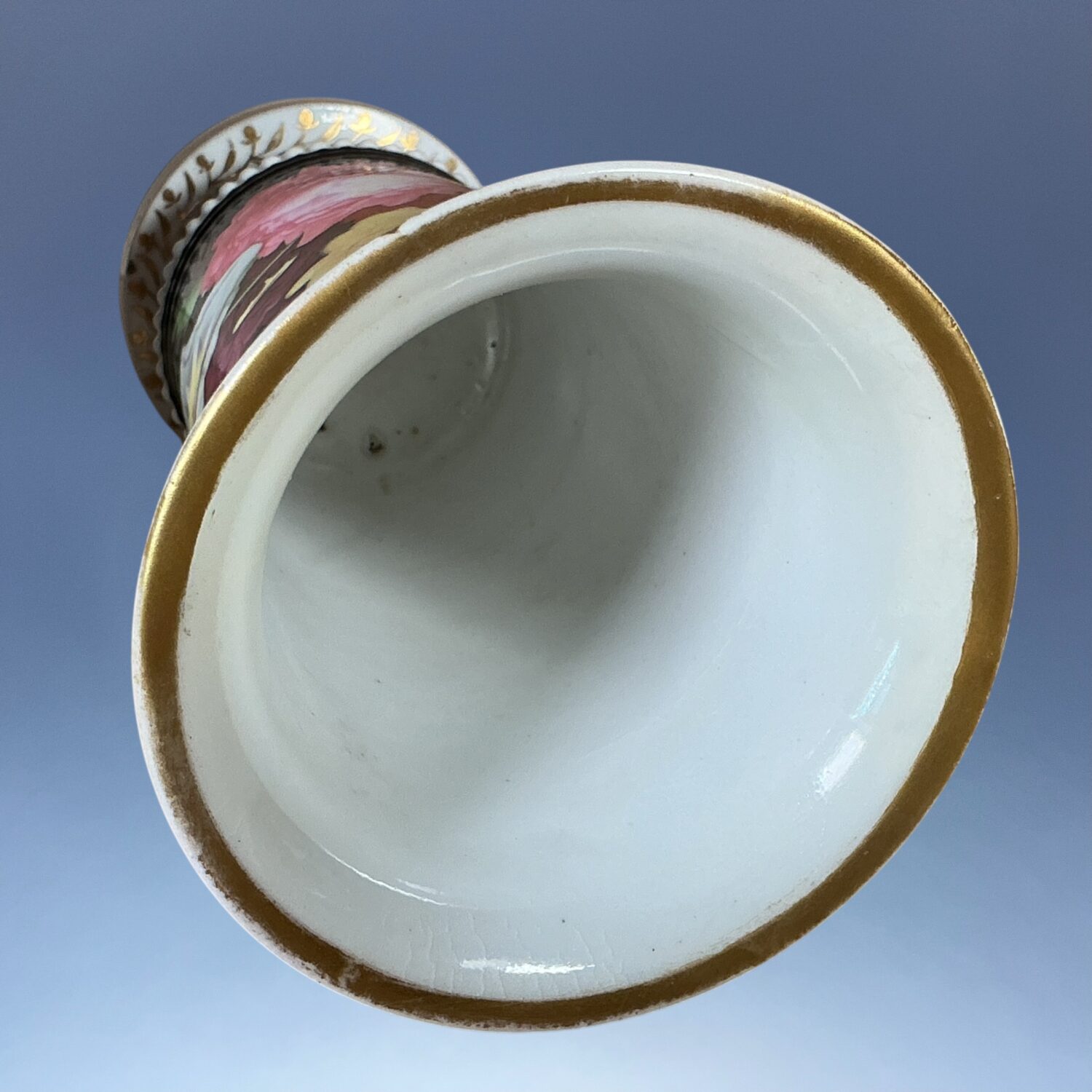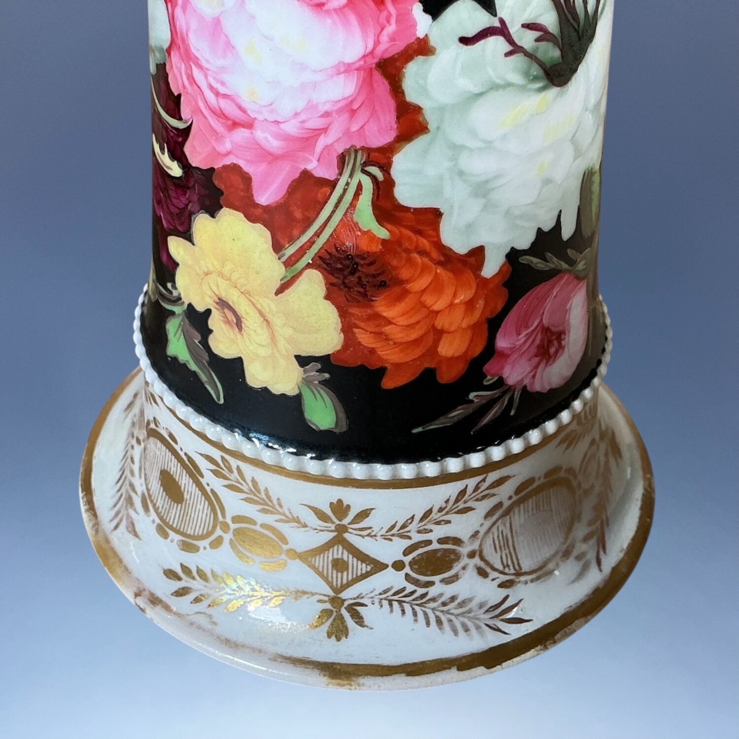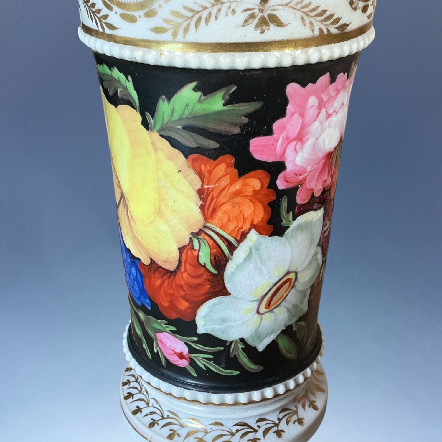 Pair of early 19th century English porcelain flare top spill vases, decorated with hand painted colourful flowers against a black ground with elaborate gilt borders.
