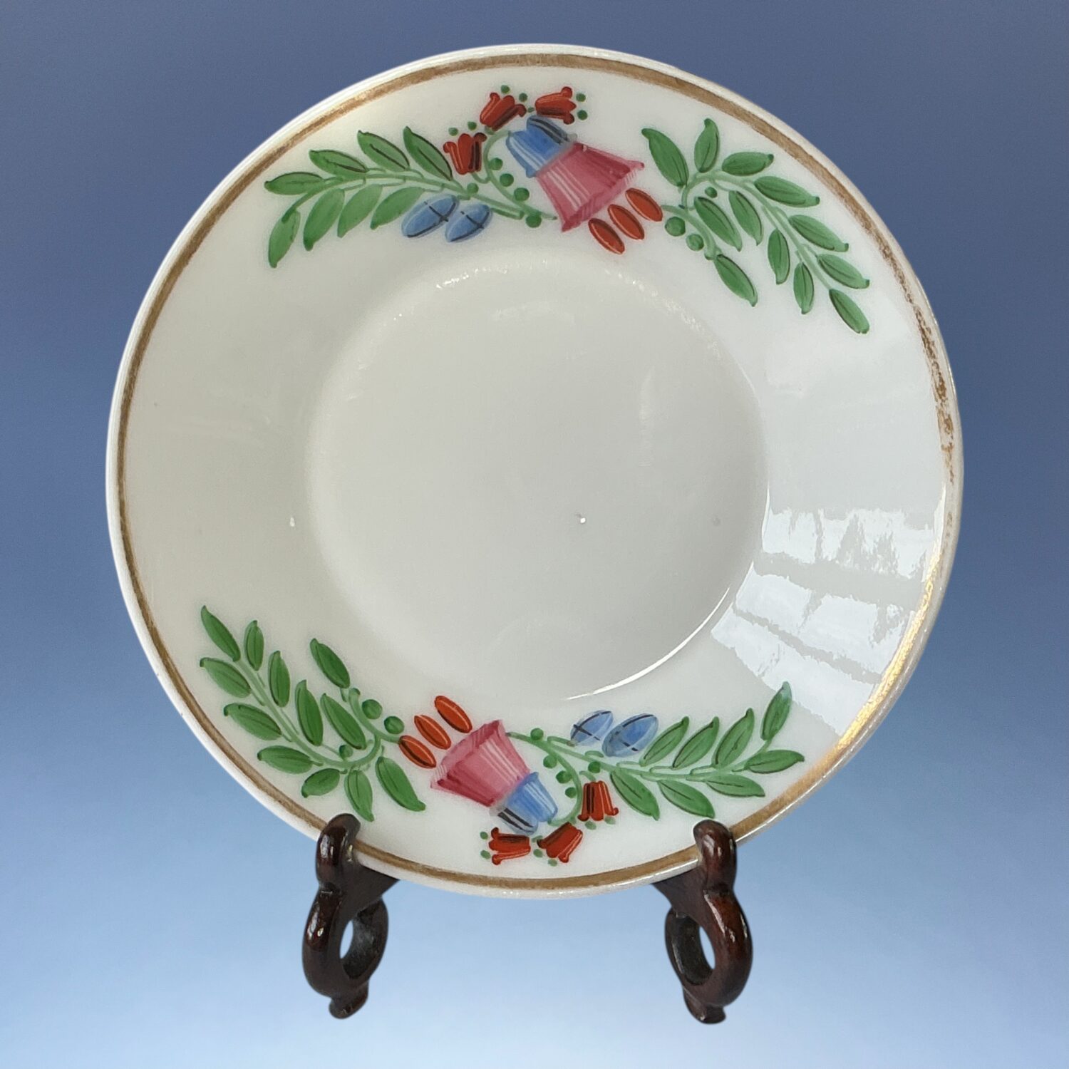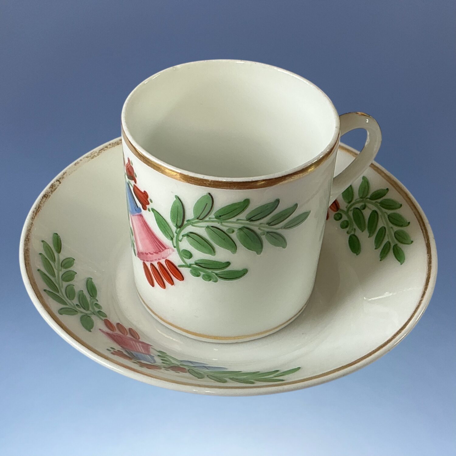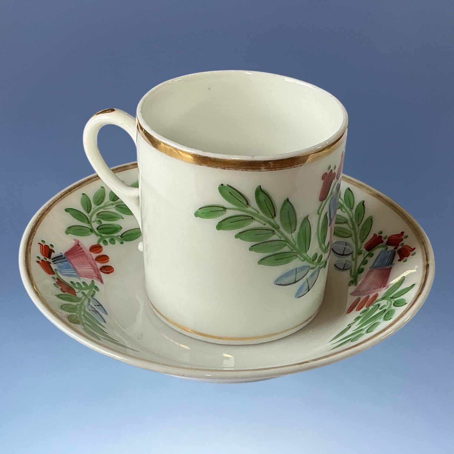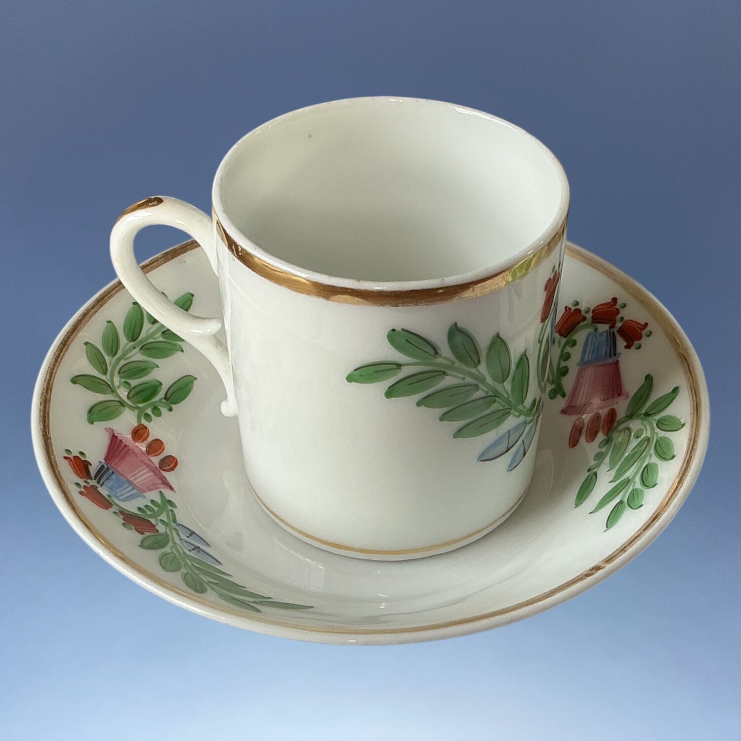 Pair of 19th century French hard paste porcelain coffee cans and saucers, decorated with hand painted stylised flowers and leaves with a gilt line.