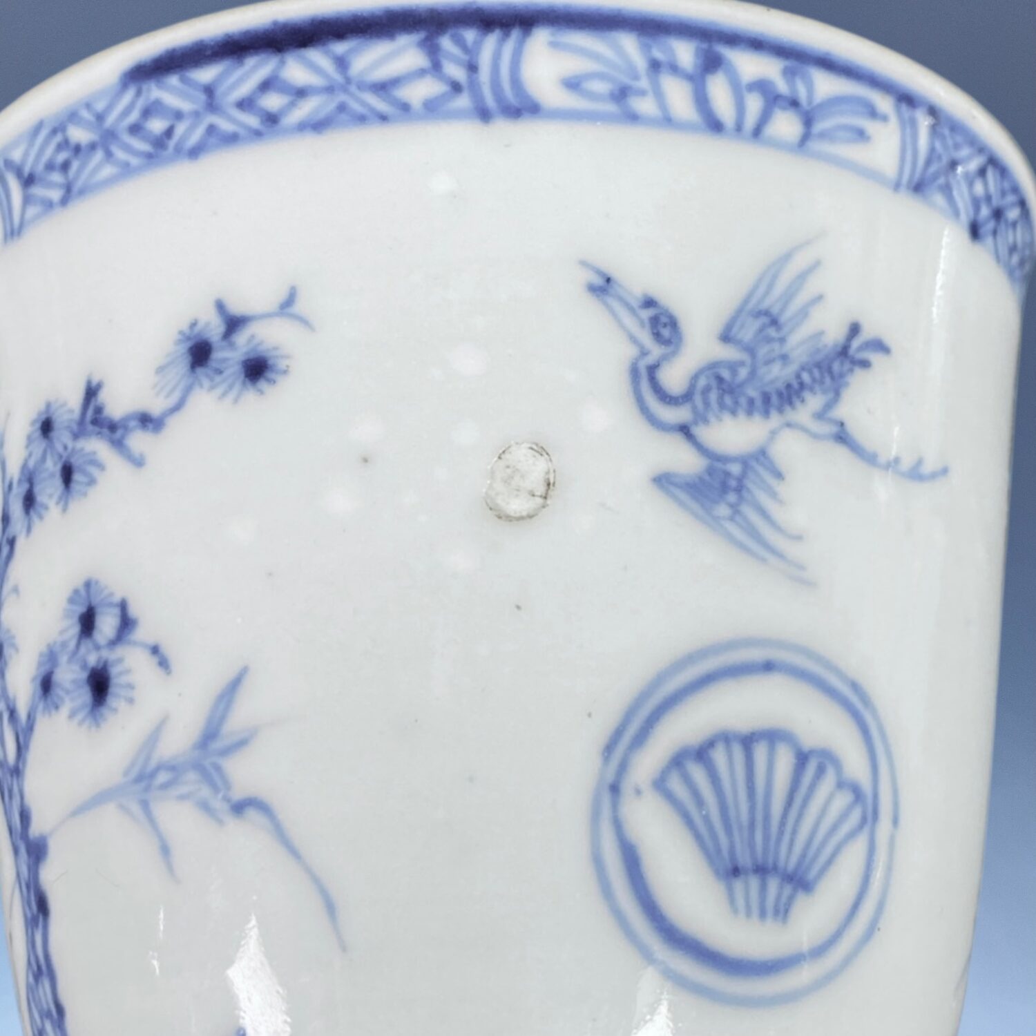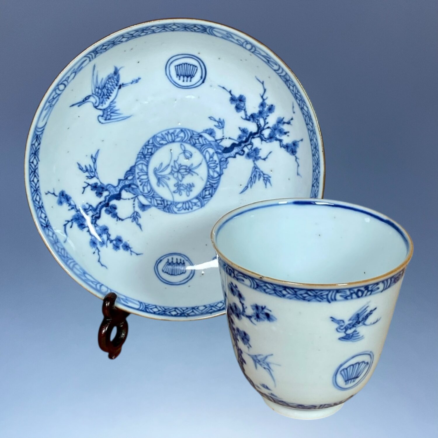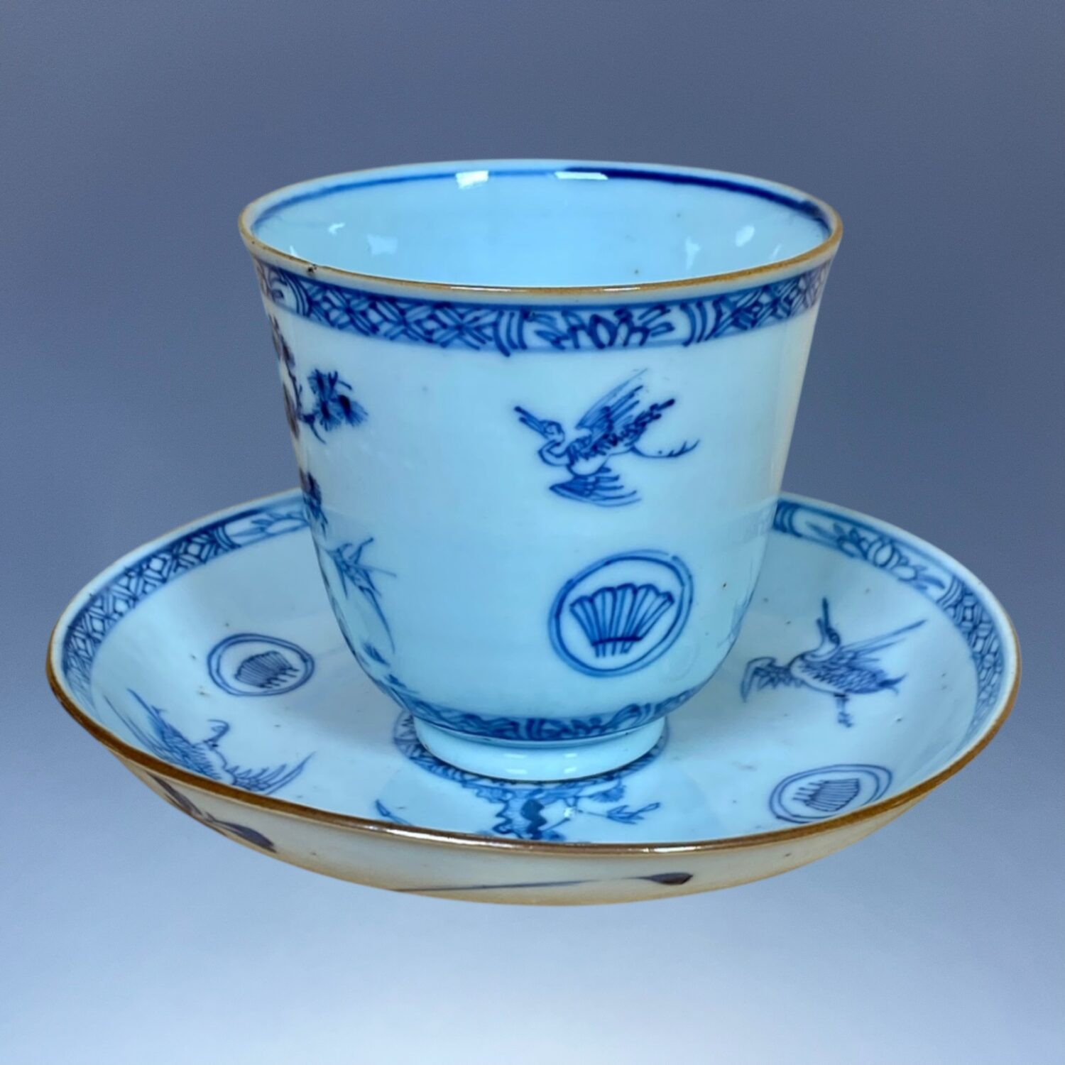 Pair of early 18th century Chinese export porcelain beakers and saucers decorated in underglaze blue with storks in flight, pine trees & diaper borders.