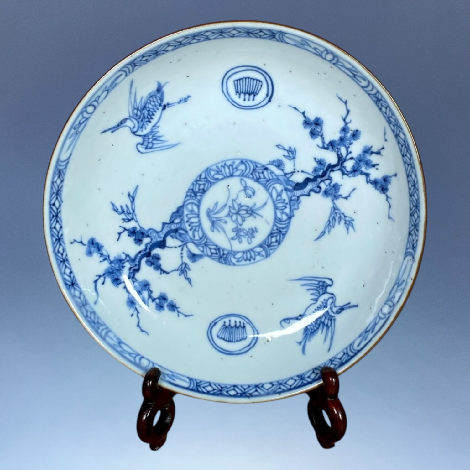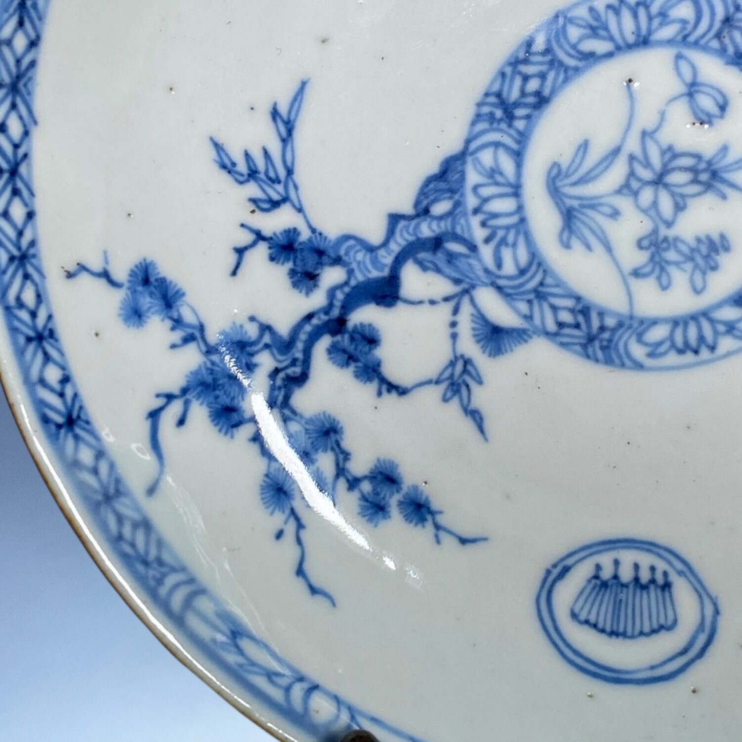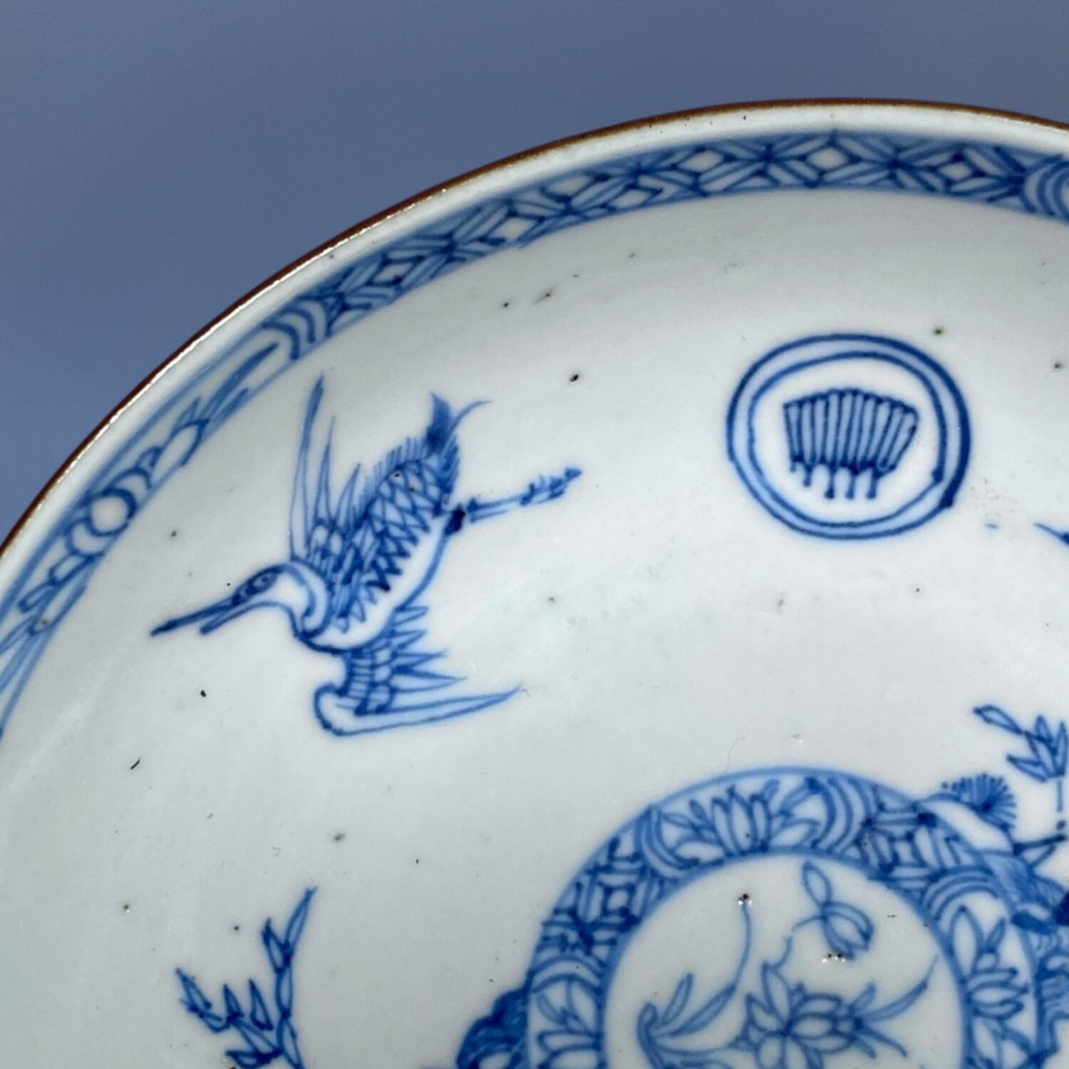 Pair of early 18th century Chinese export porcelain beakers and saucers decorated in underglaze blue with storks in flight, pine trees & diaper borders.