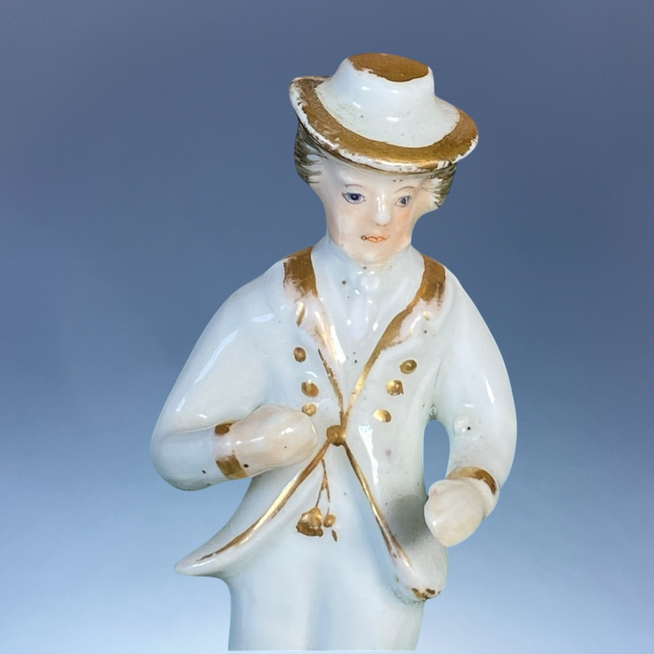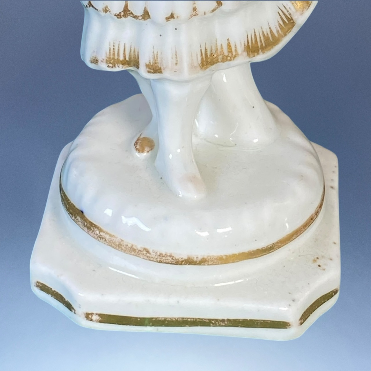 Pair of 19th century Staffordshire porcelain miniature figures of a young couple dancing, decorated with gilding and fleshtones.