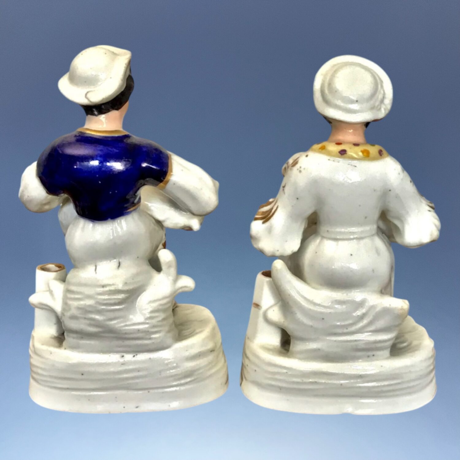 A good quality and unusual pair of 19th century Staffordshire porcelain seated figures of a shepherd shearing a sheep & a shepherdess holding a lamb on her lap, on pen holder bases with a gilt line.