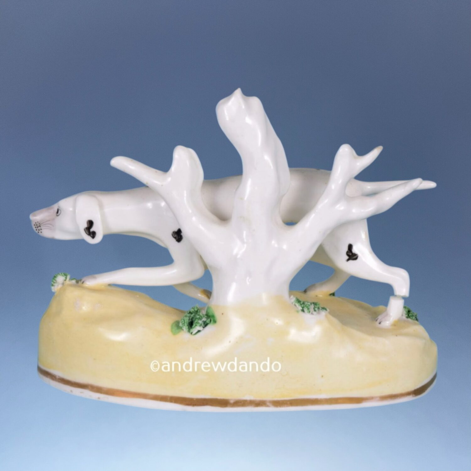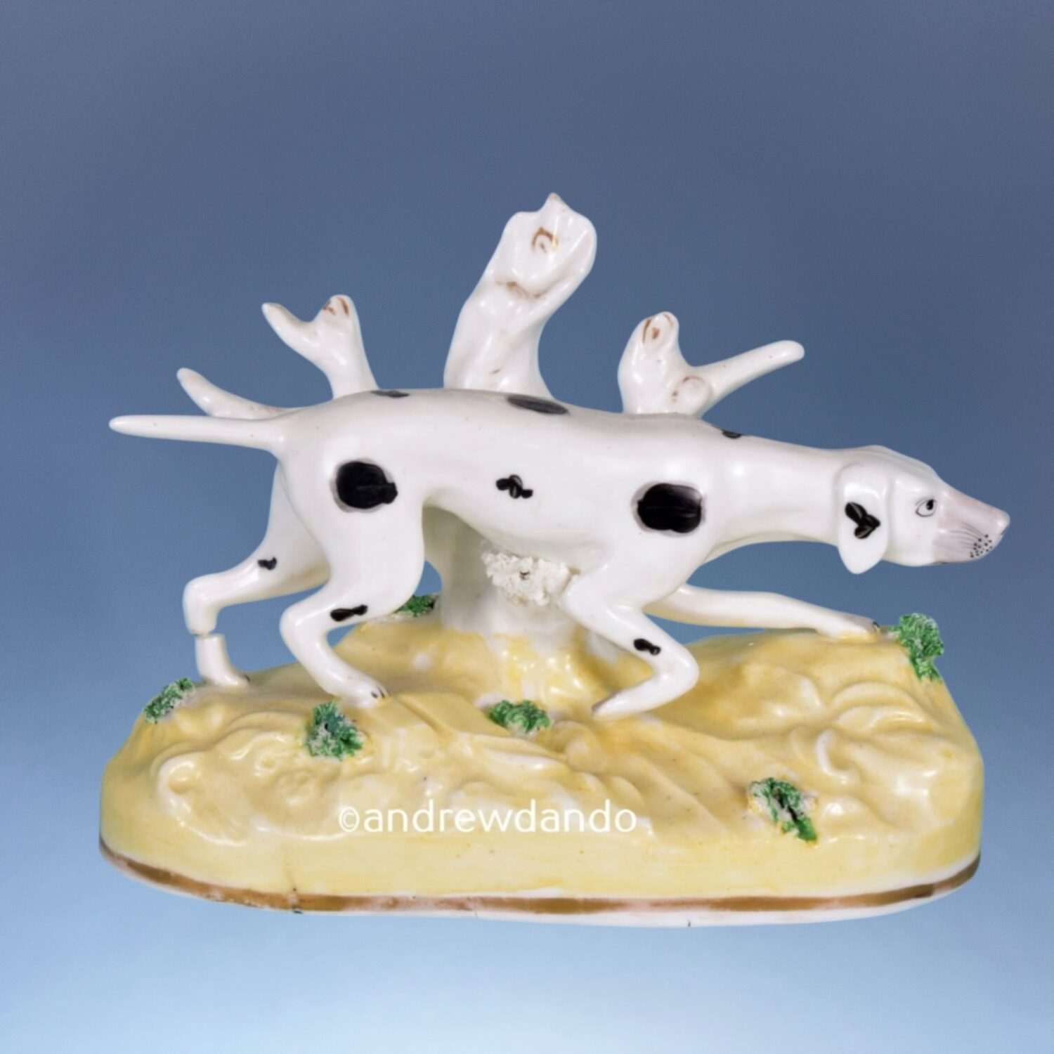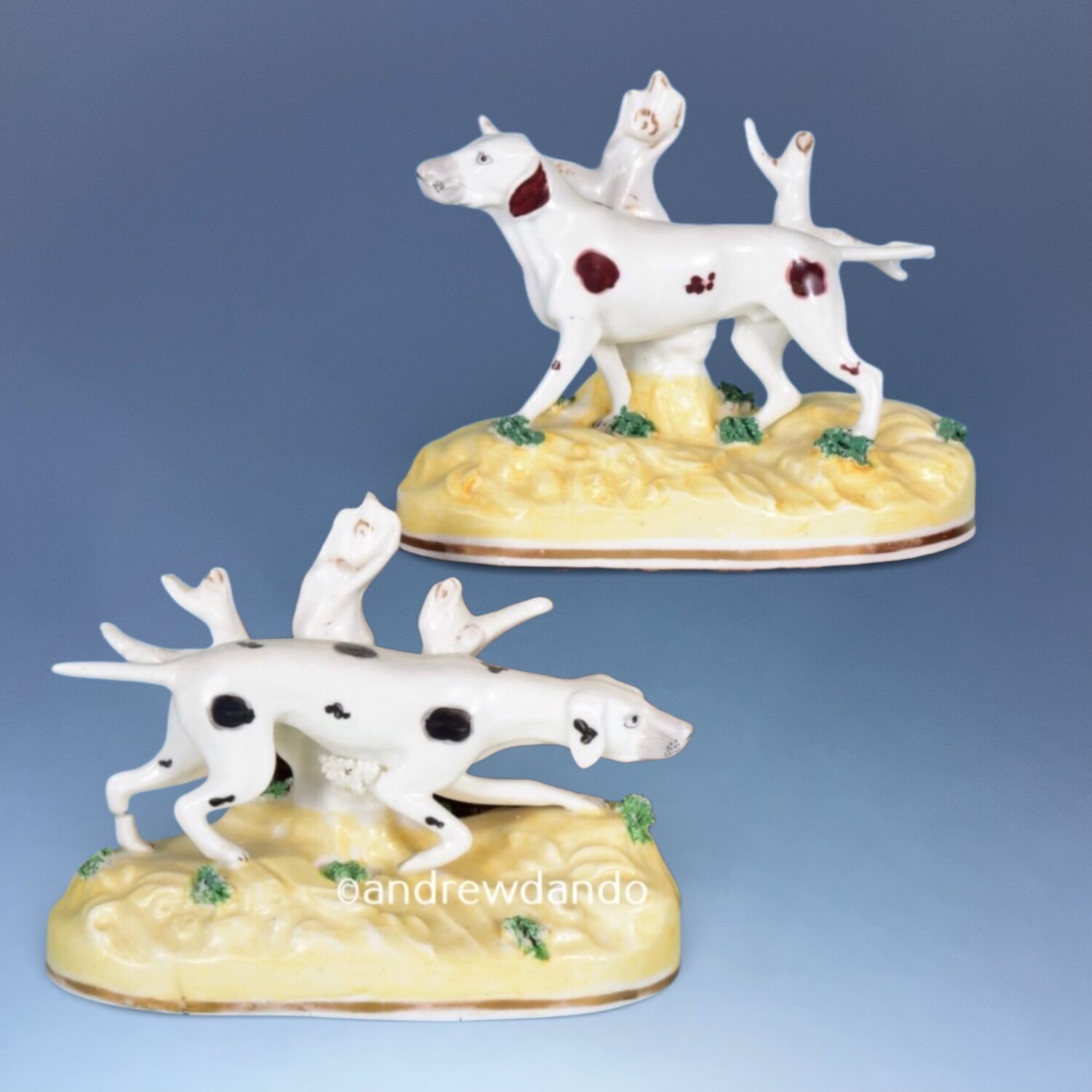 A good quality and unusual pair of 19th century Staffordshire porcelain models of Pointers, standing on pale yellow mound bases with gilt lines.