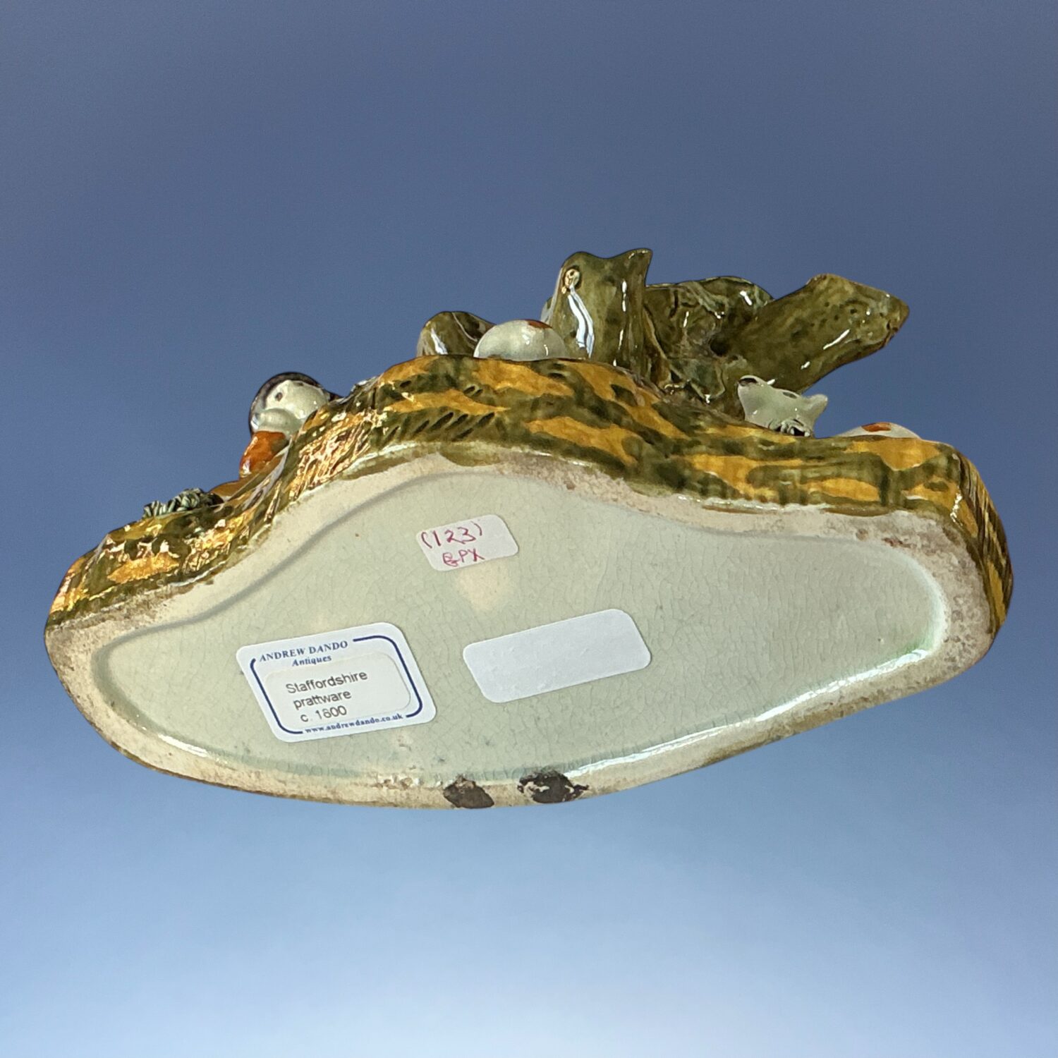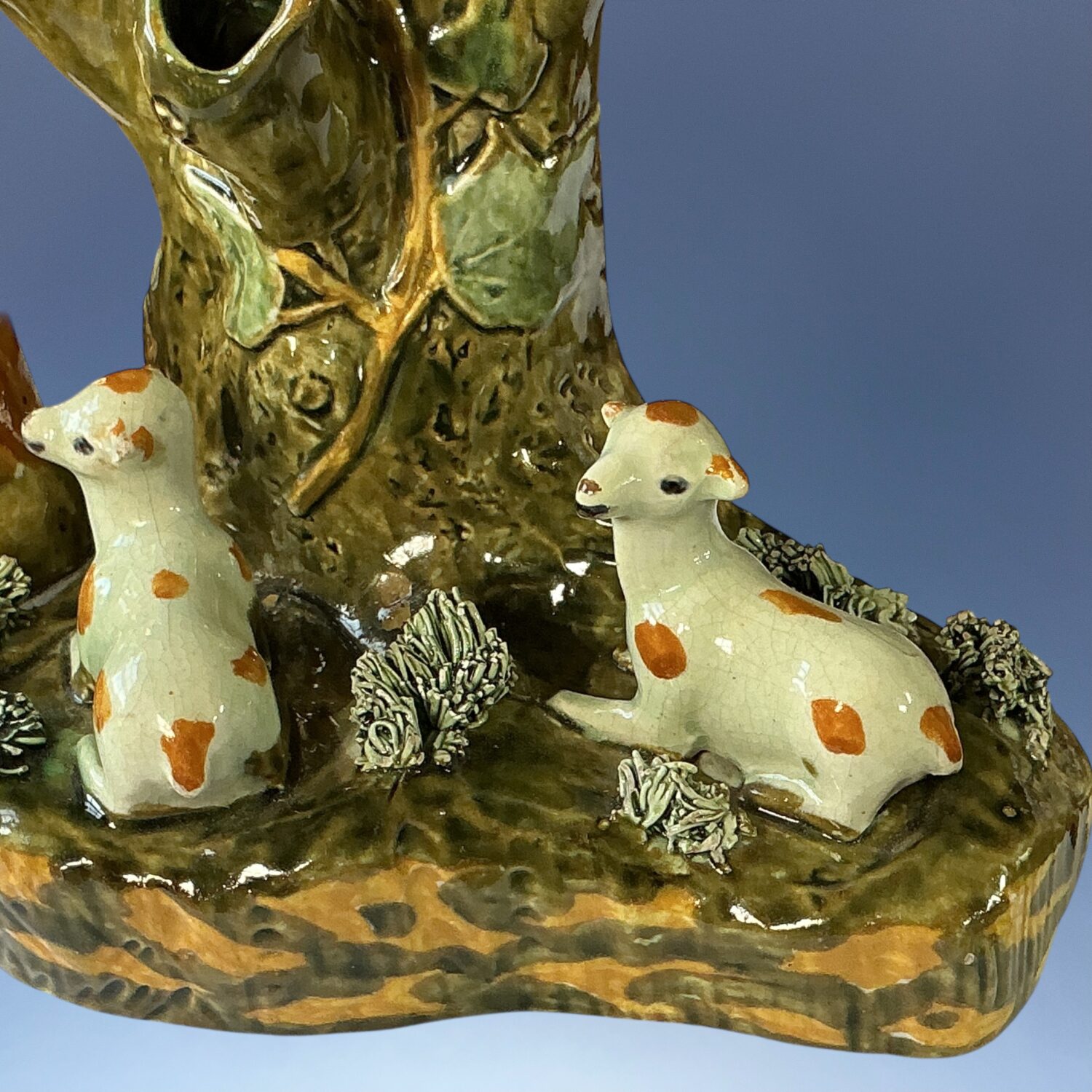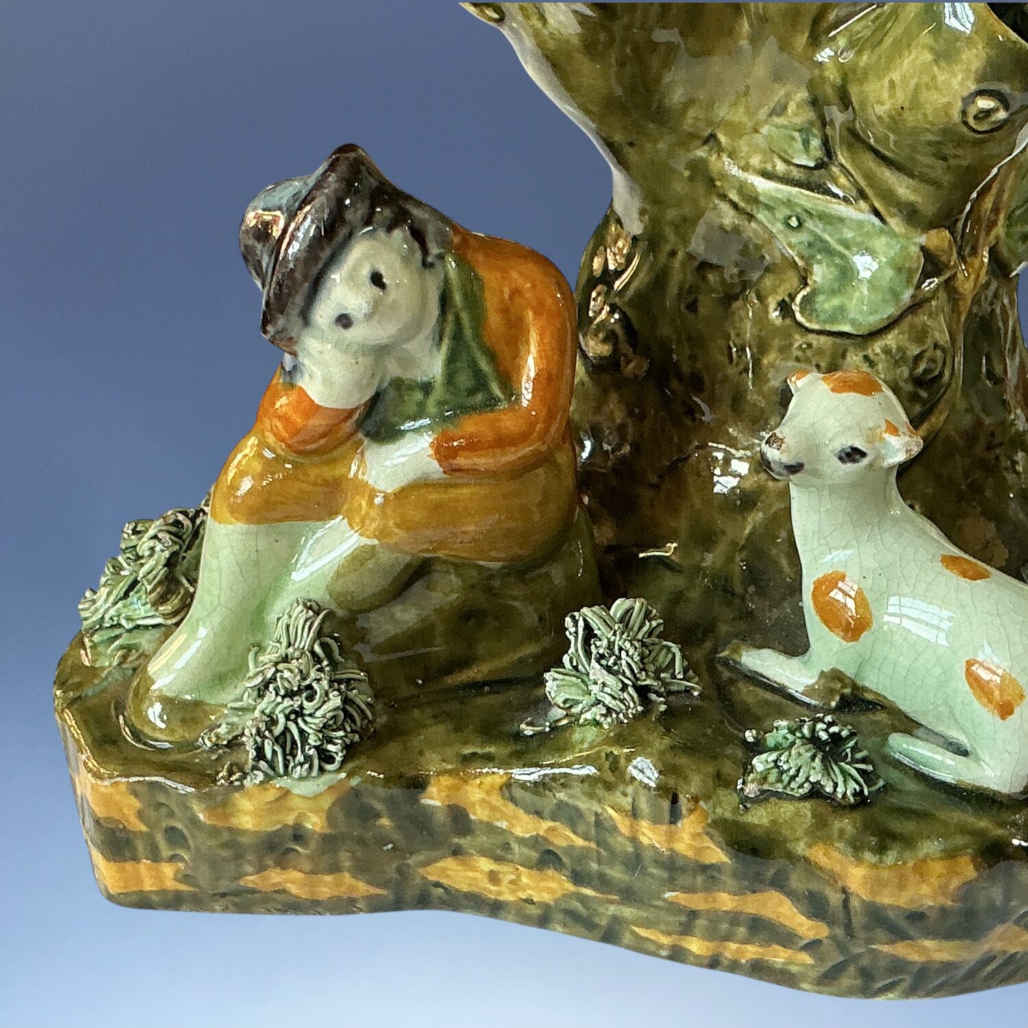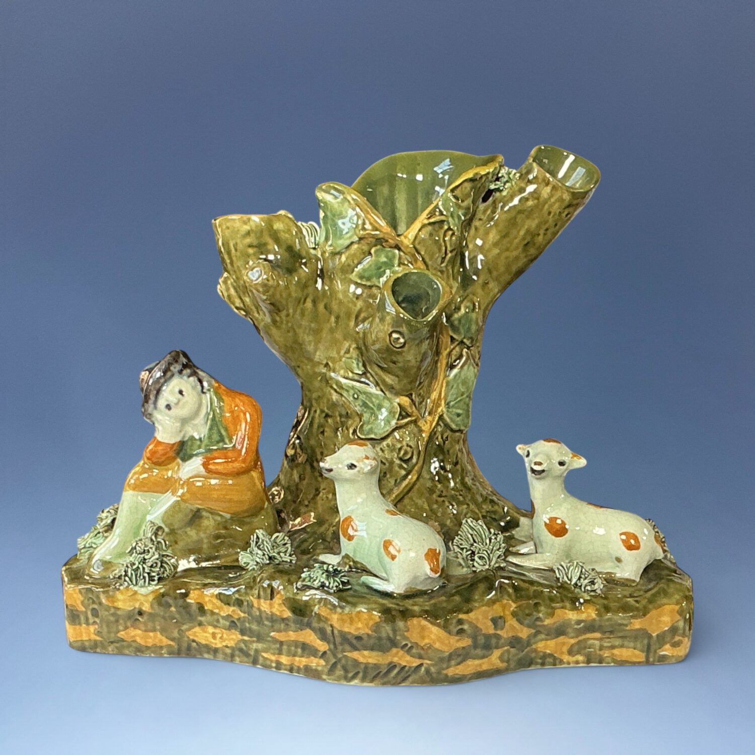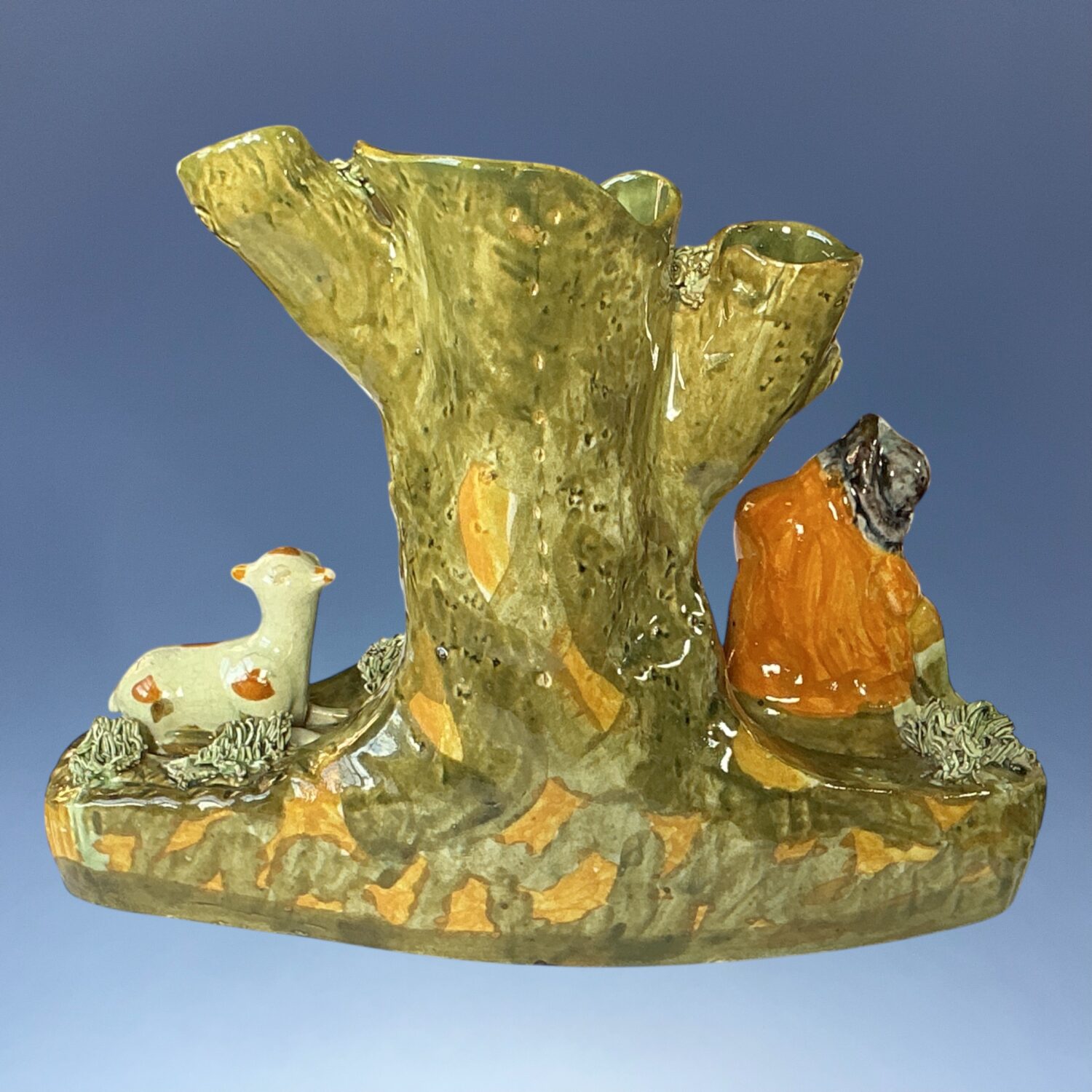 Good quality English pottery tree spill vase group with a shepherd and two sheep, decorated with high temperature underglaze ‘Pratt’ type colours.