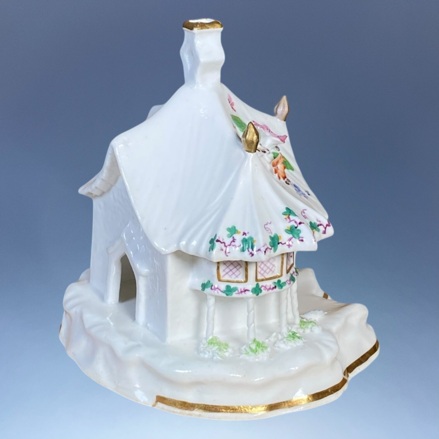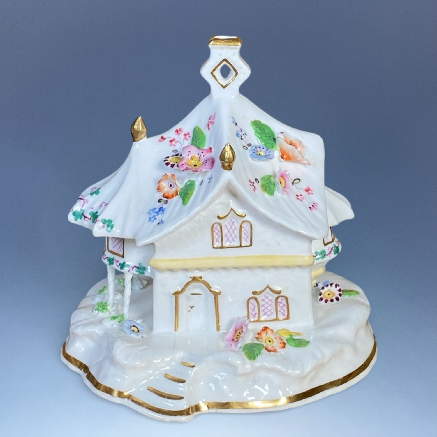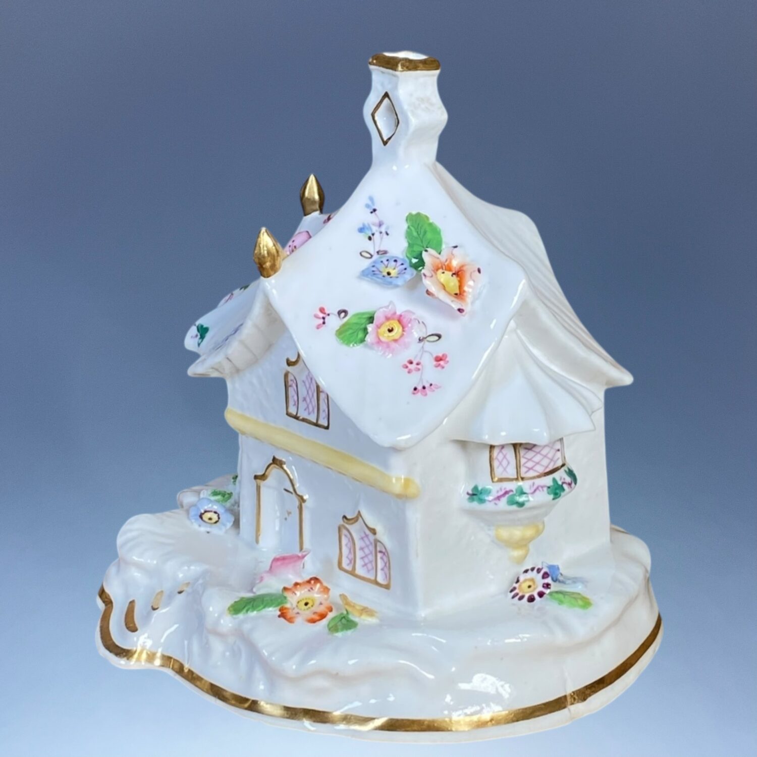 A good quality 19th century Staffordshire porcelain Cottage Orné Pastille Burner, decorated with fine applied and painted flowers & gilding.