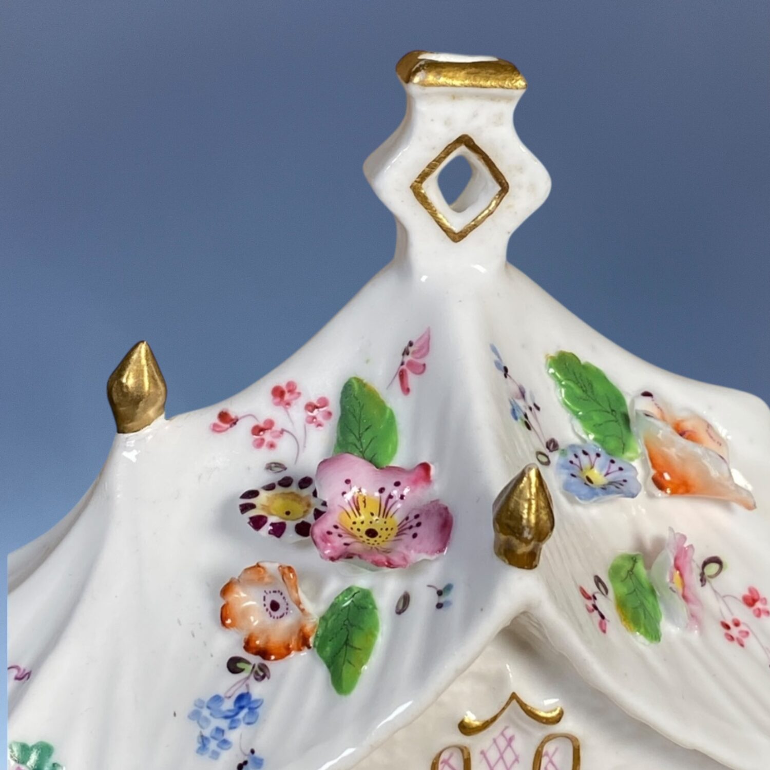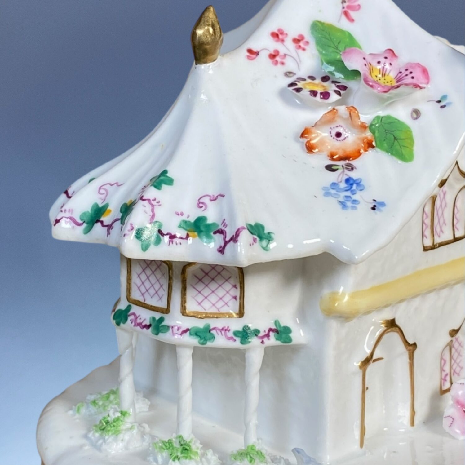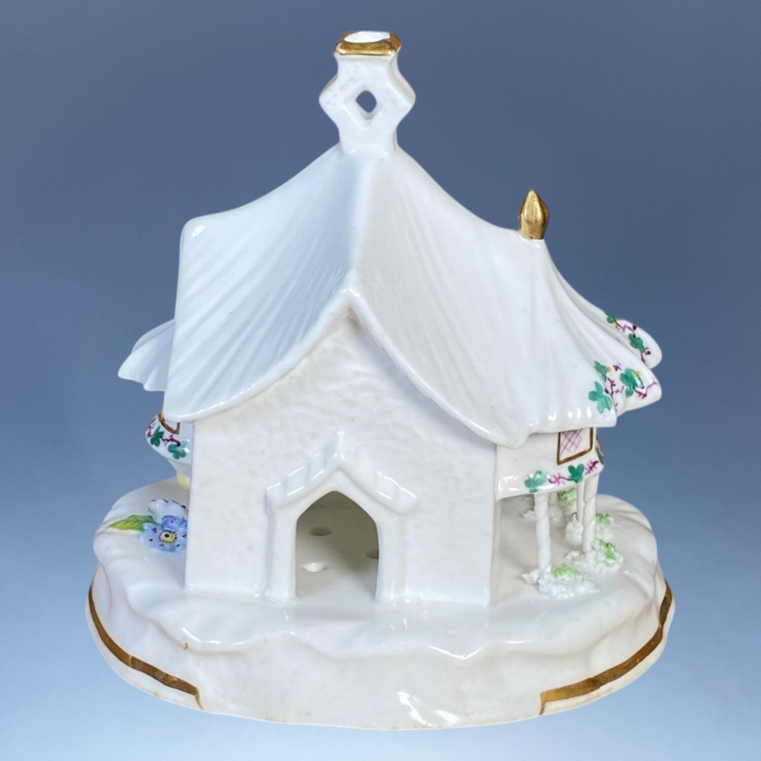 A good quality 19th century Staffordshire porcelain Cottage Orné Pastille Burner, decorated with fine applied and painted flowers & gilding.