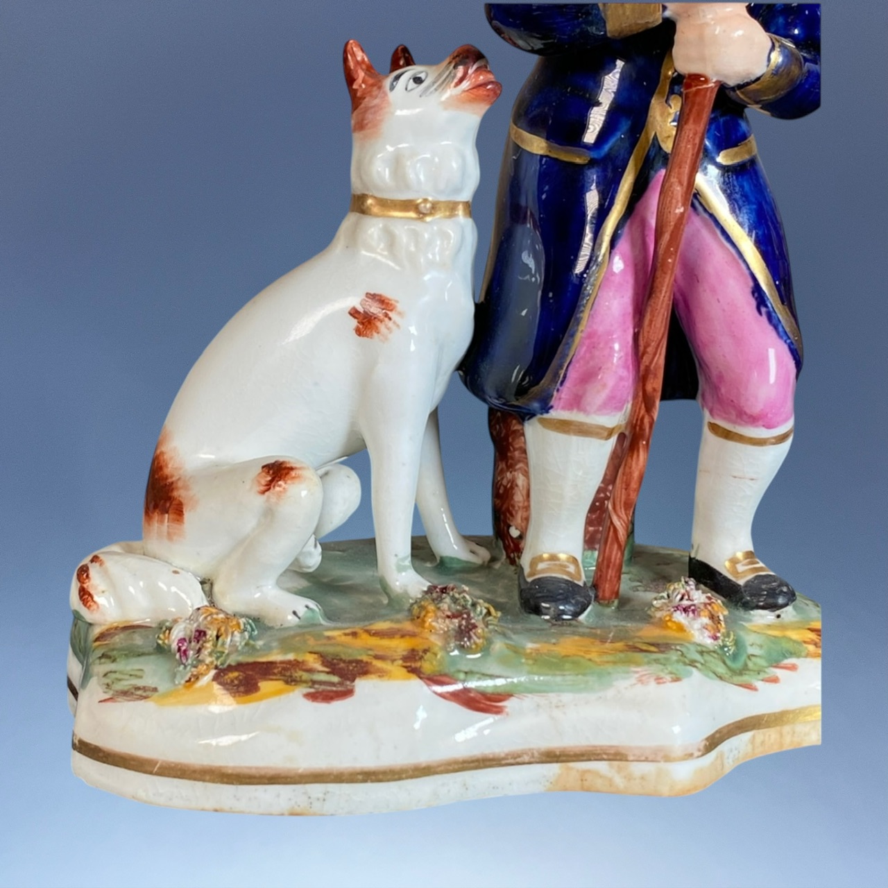 An unusual mid 19th century Staffordshire figure of a shepherd holding a stick, his dog sitting at his side.