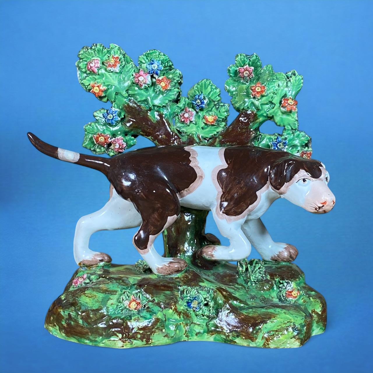 A good quality early 19th century Staffordshire pottery model of a Pointer, standing on a mound base with elaborate floral and leaf bocage.