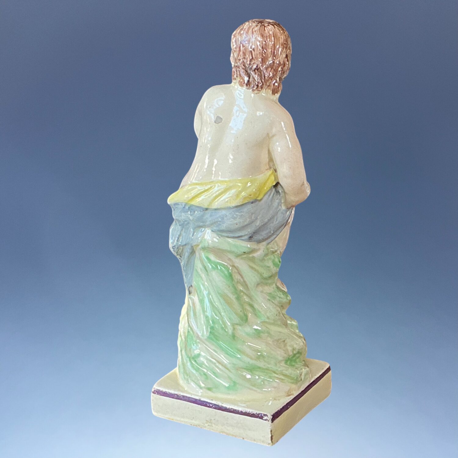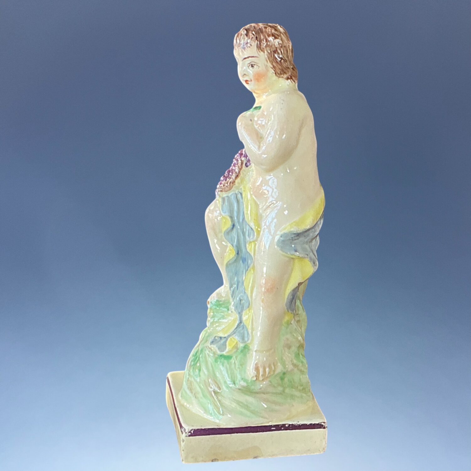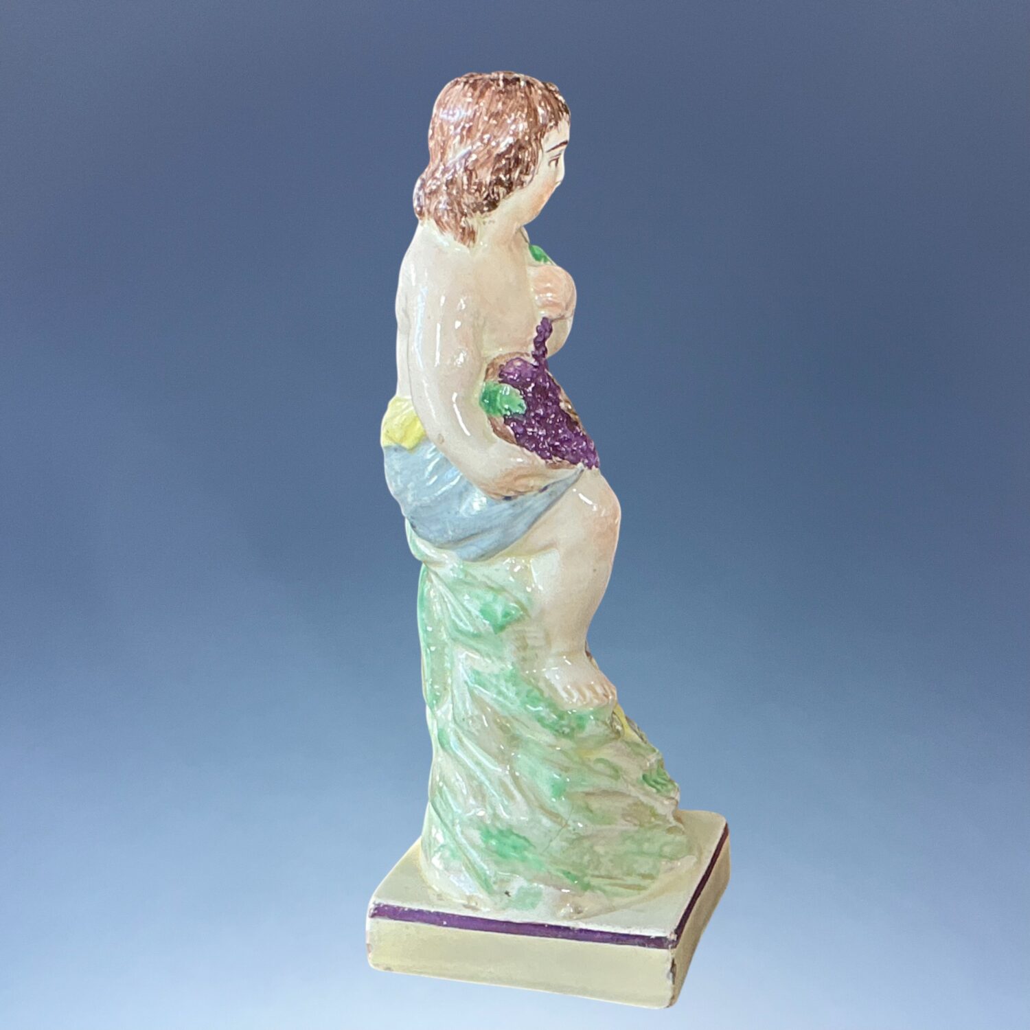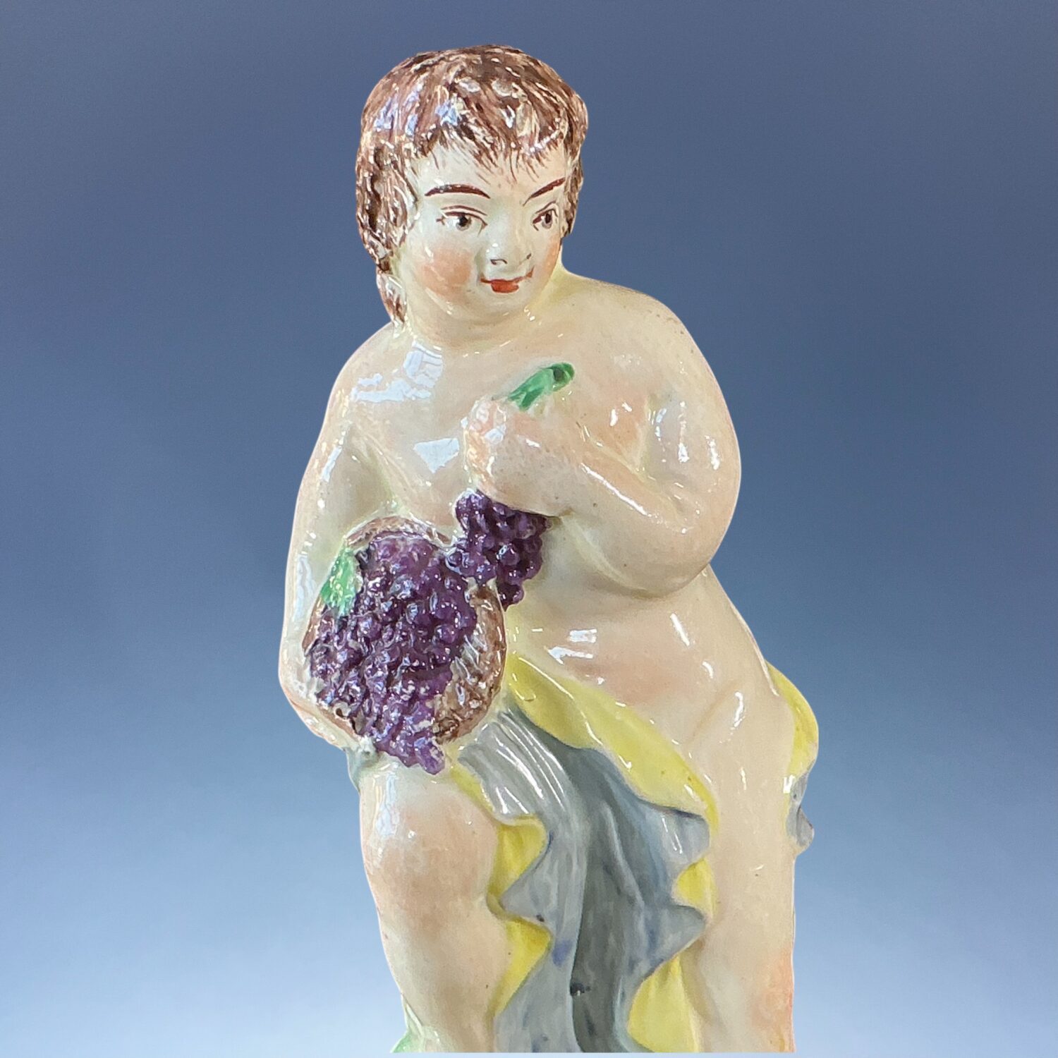 Early Staffordshire pottery small figure of a boy holding a basket of grapes, emblematic of Autumn from a set of the four seasons.