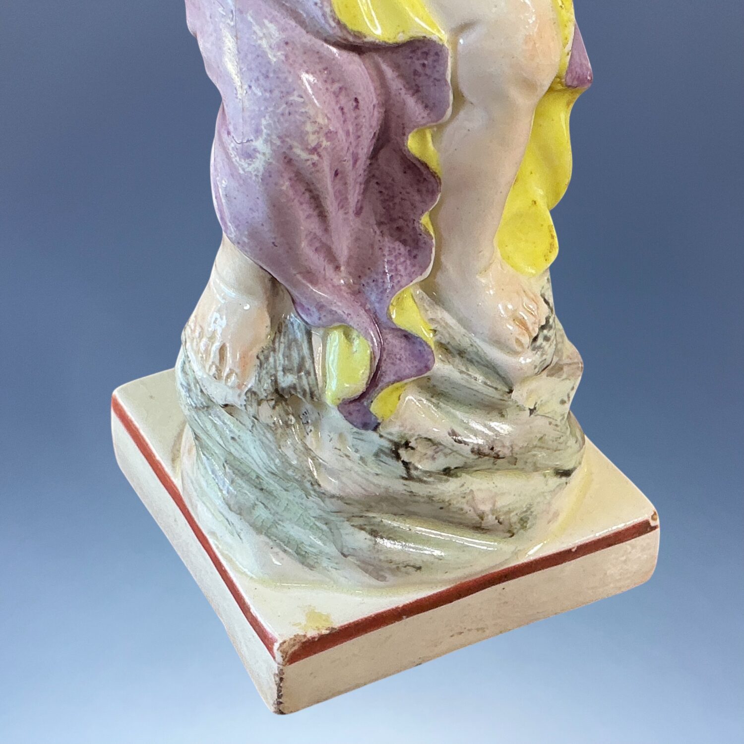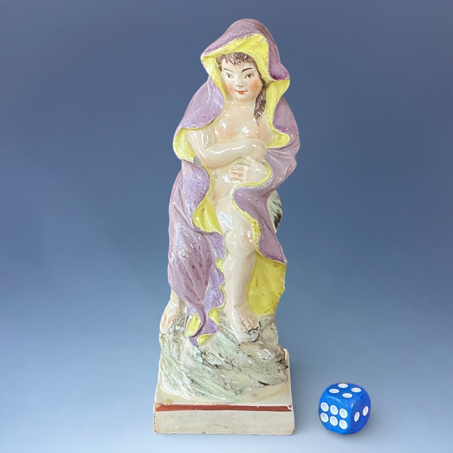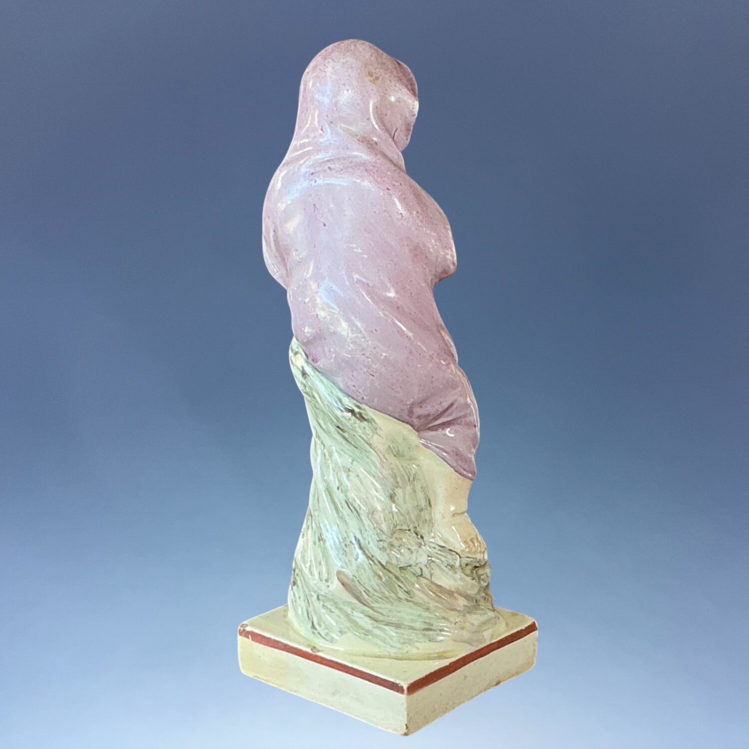 Early Staffordshire pottery small figure of a boy wearing a cloak, emblematic of Winter from a set of the four seasons.