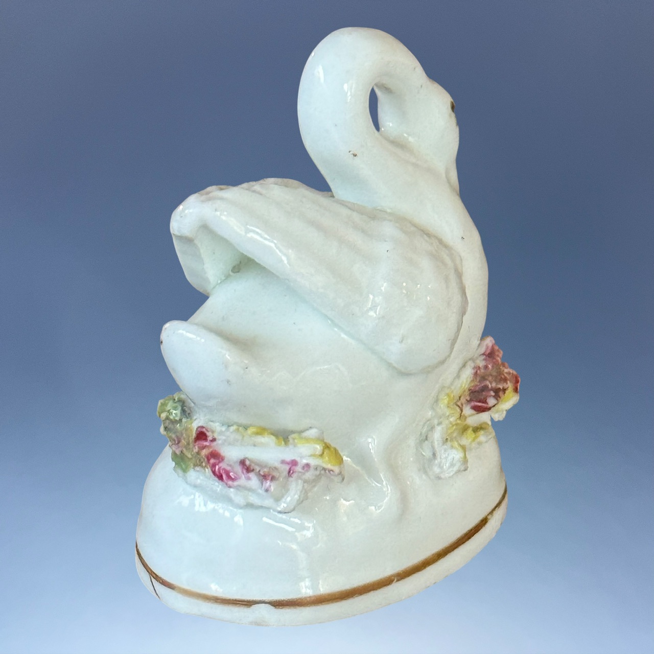 19th century Staffordshire porcelain miniature model of a Swan, with coloured foliage and a gilt line around the base.
