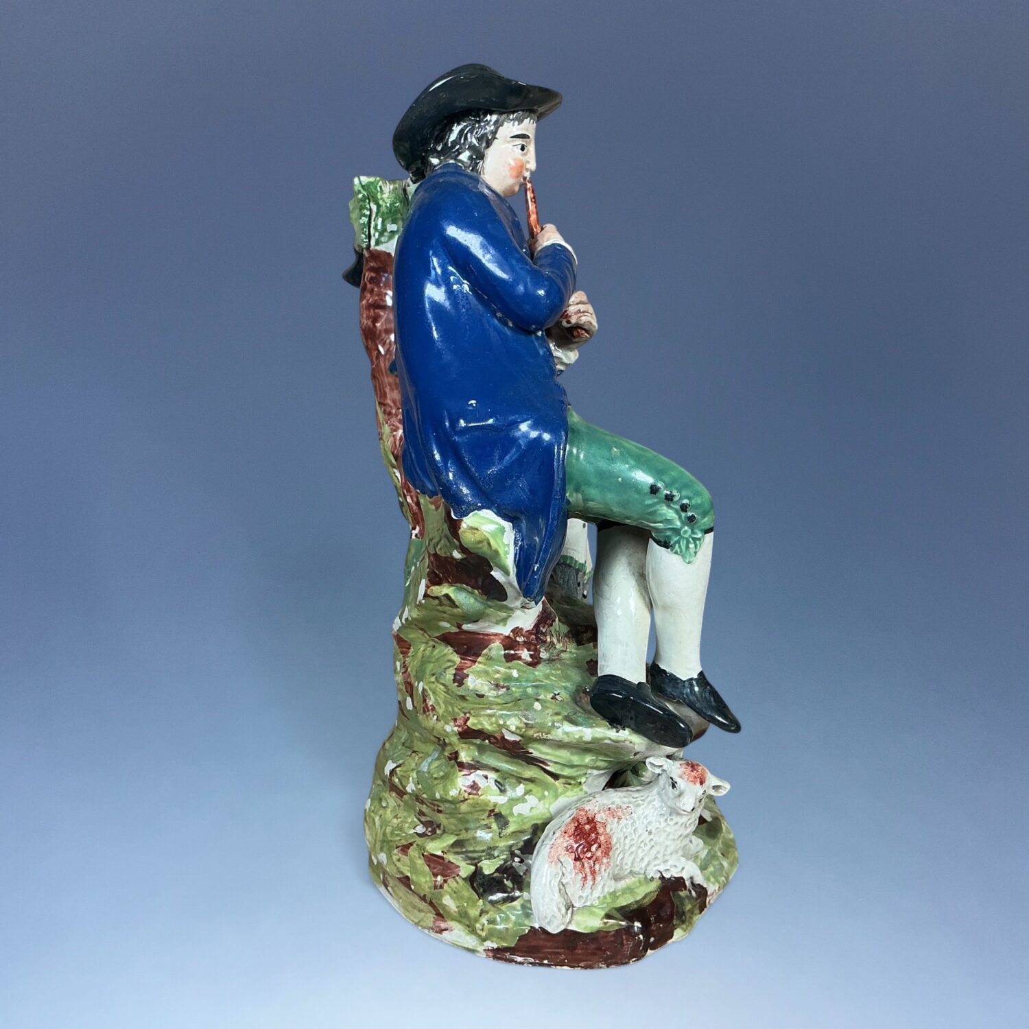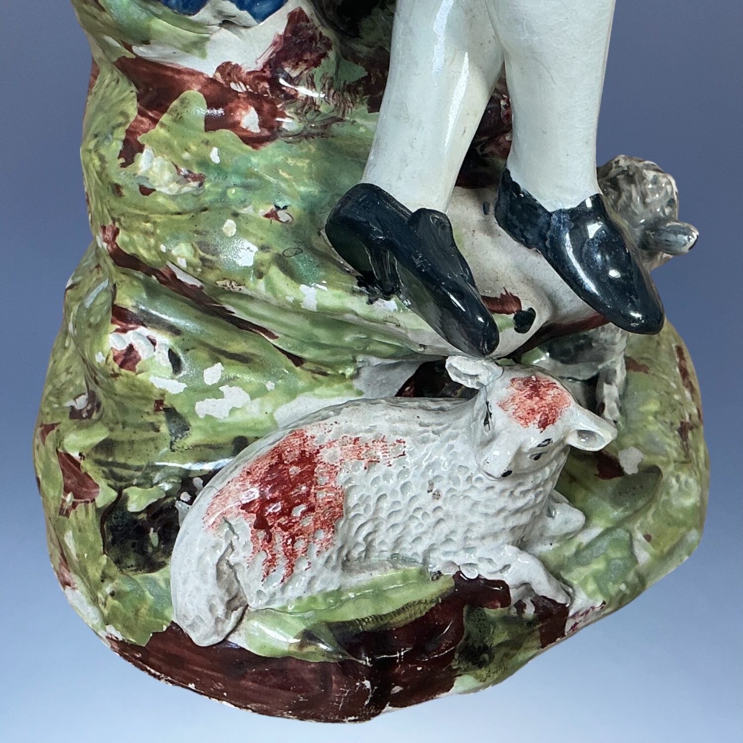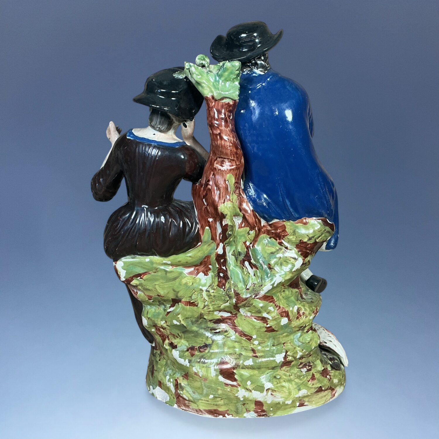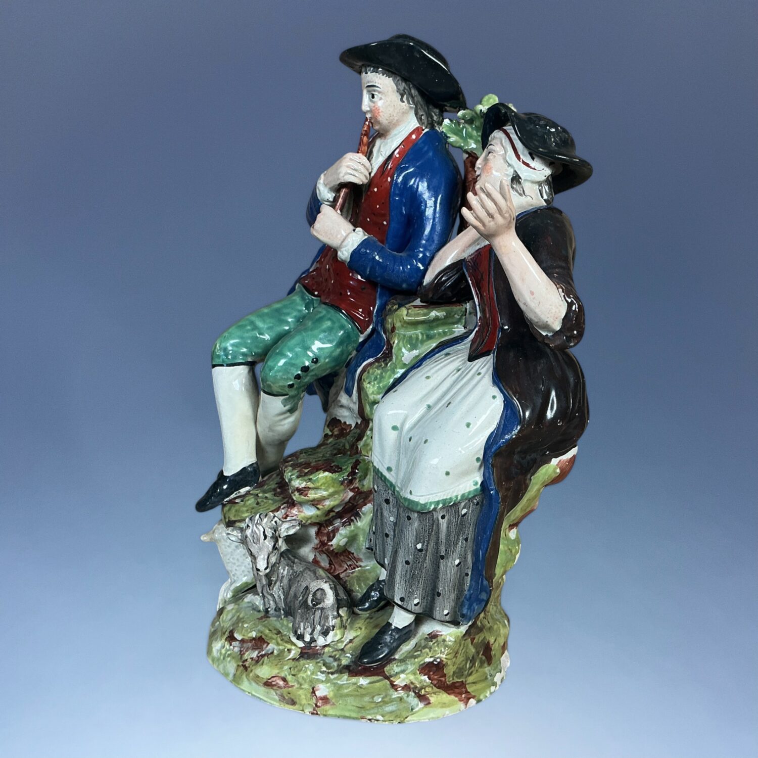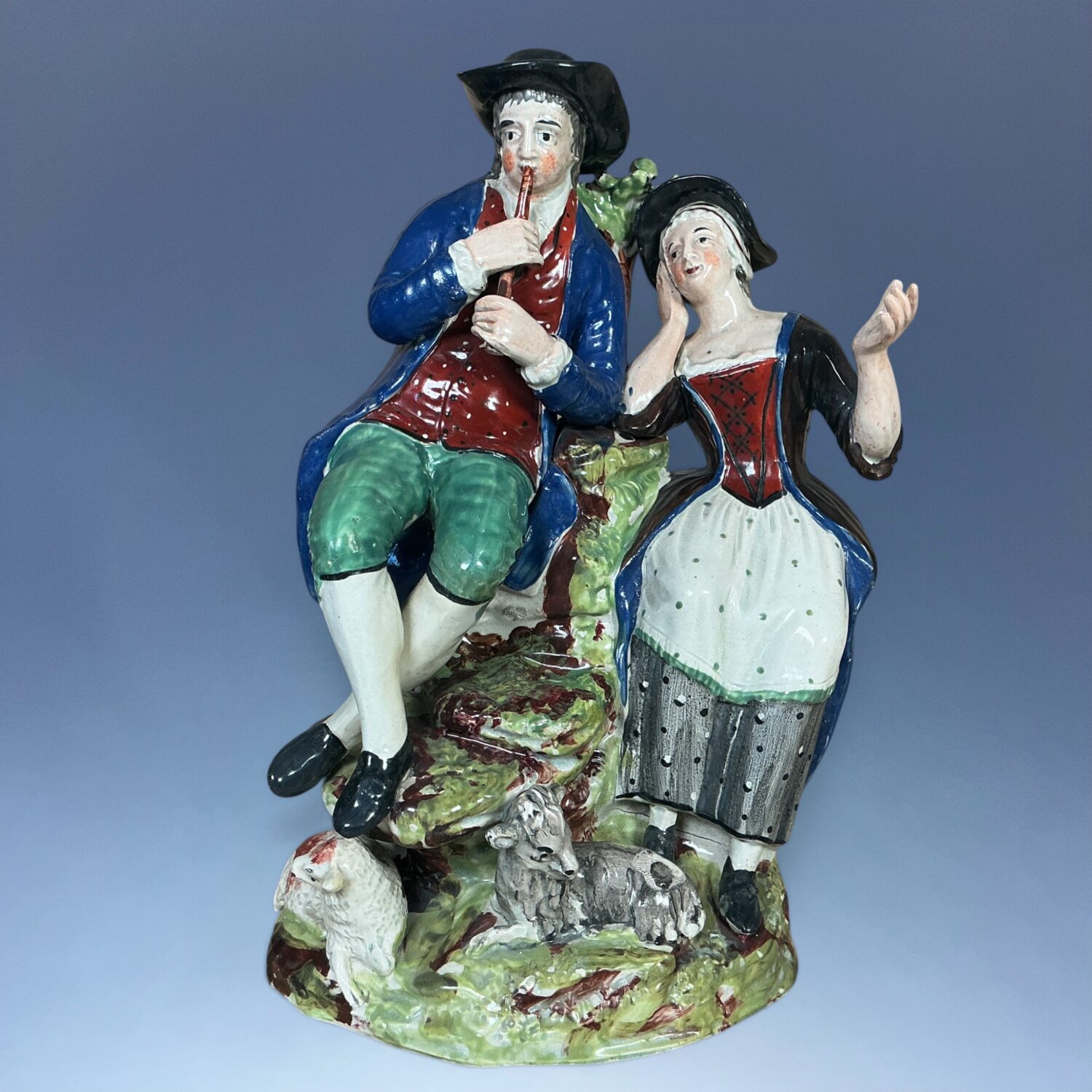 A boldly decorated early 19th century Staffordshire pottery large group of Shepherd and Shepherdess, seated on a rocky mound base with a lamb and a goat at their feet.