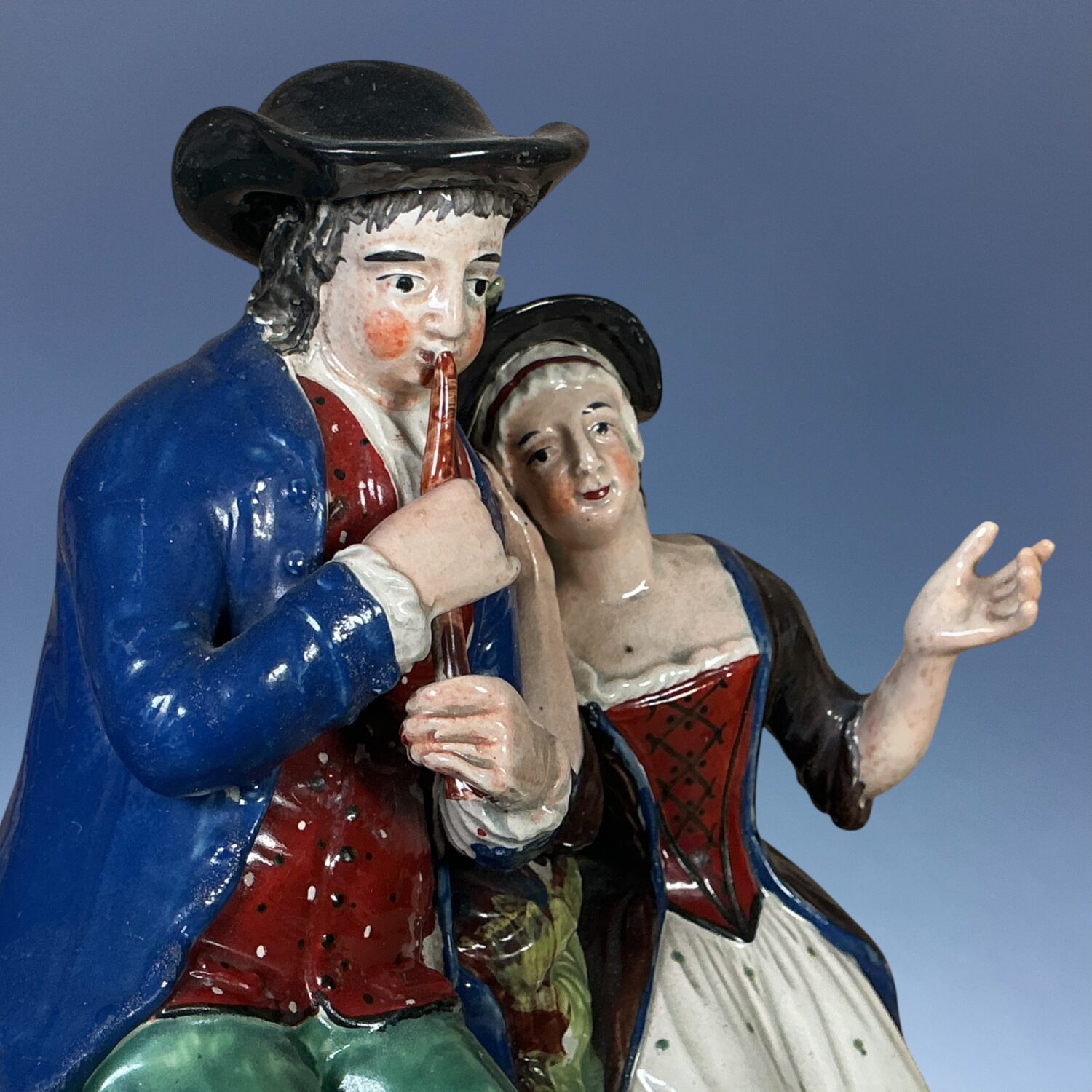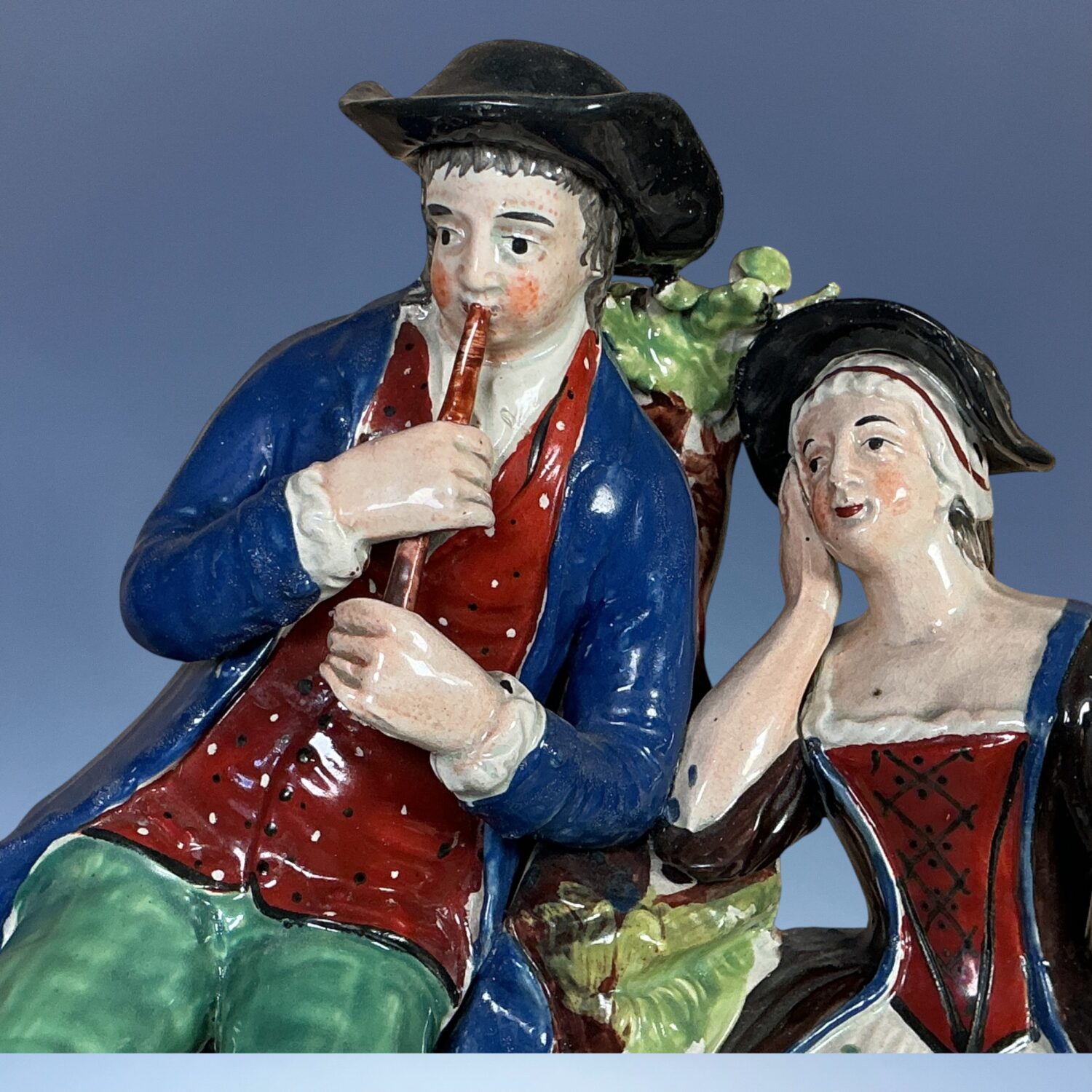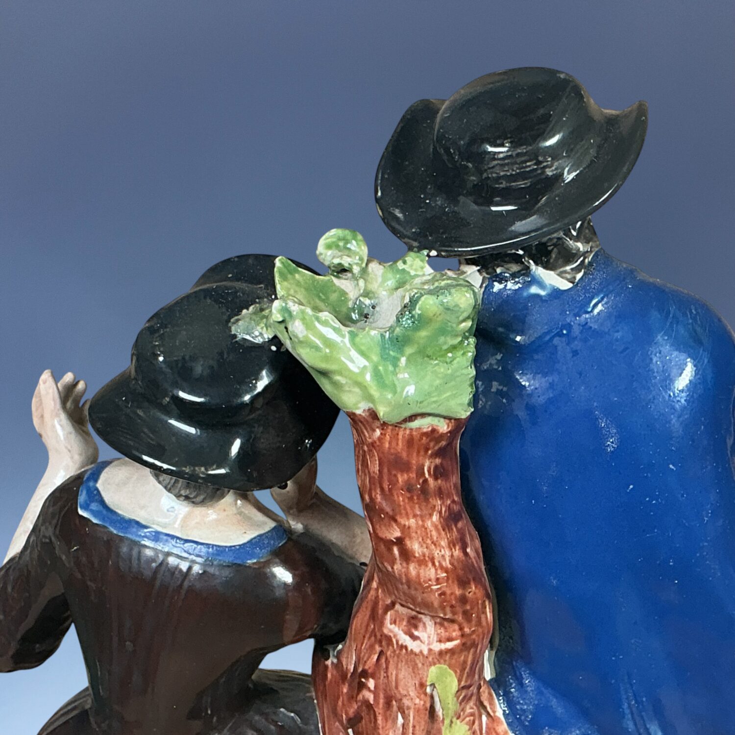 Condition : A little good restoration to: Her left hand, chips to the brim of both hats, tiny piece of pipe, lamb’s left ear, goat’s right ear. It is likely that originally there was a seated dog beside the shepherd’s left knee. Small loss to bocage.