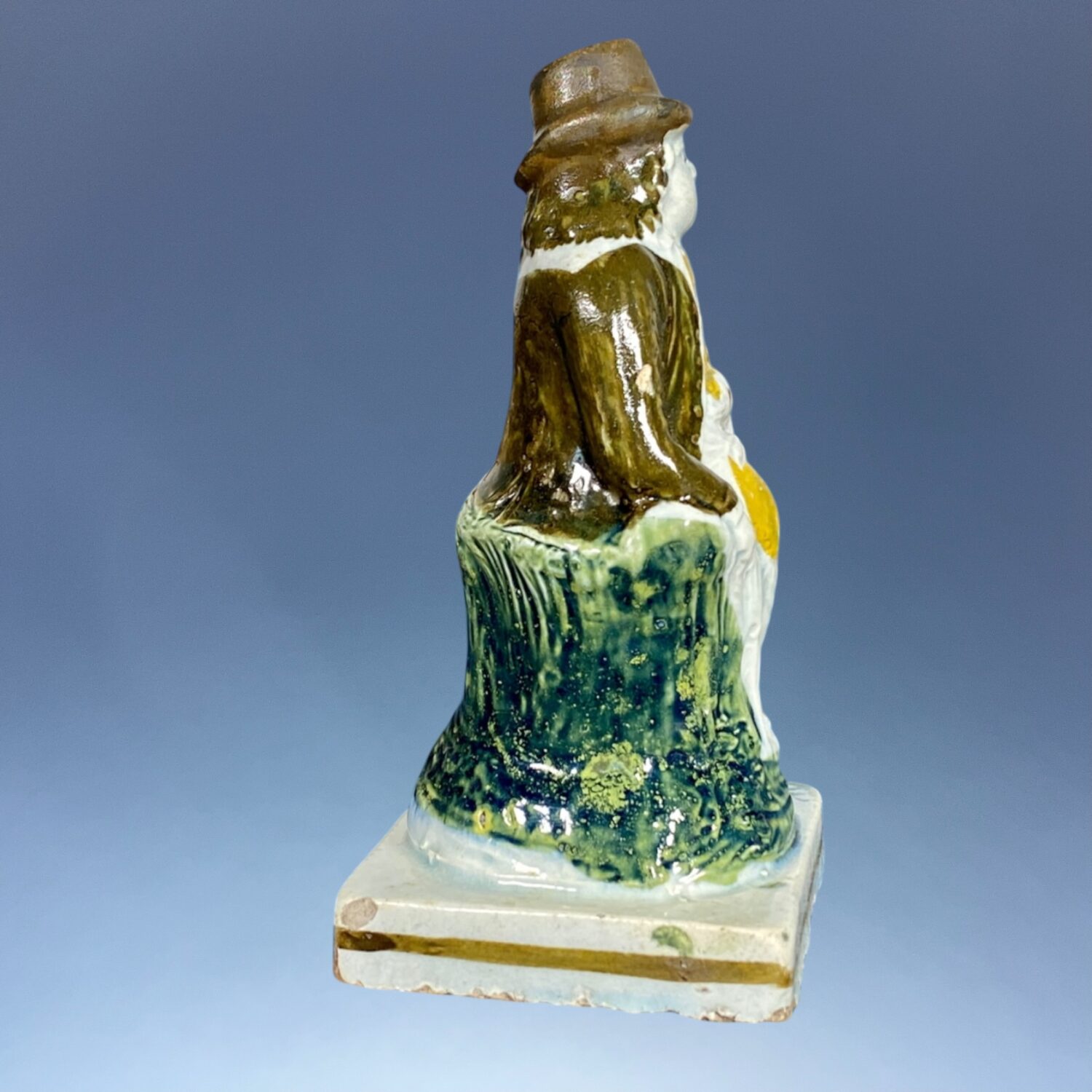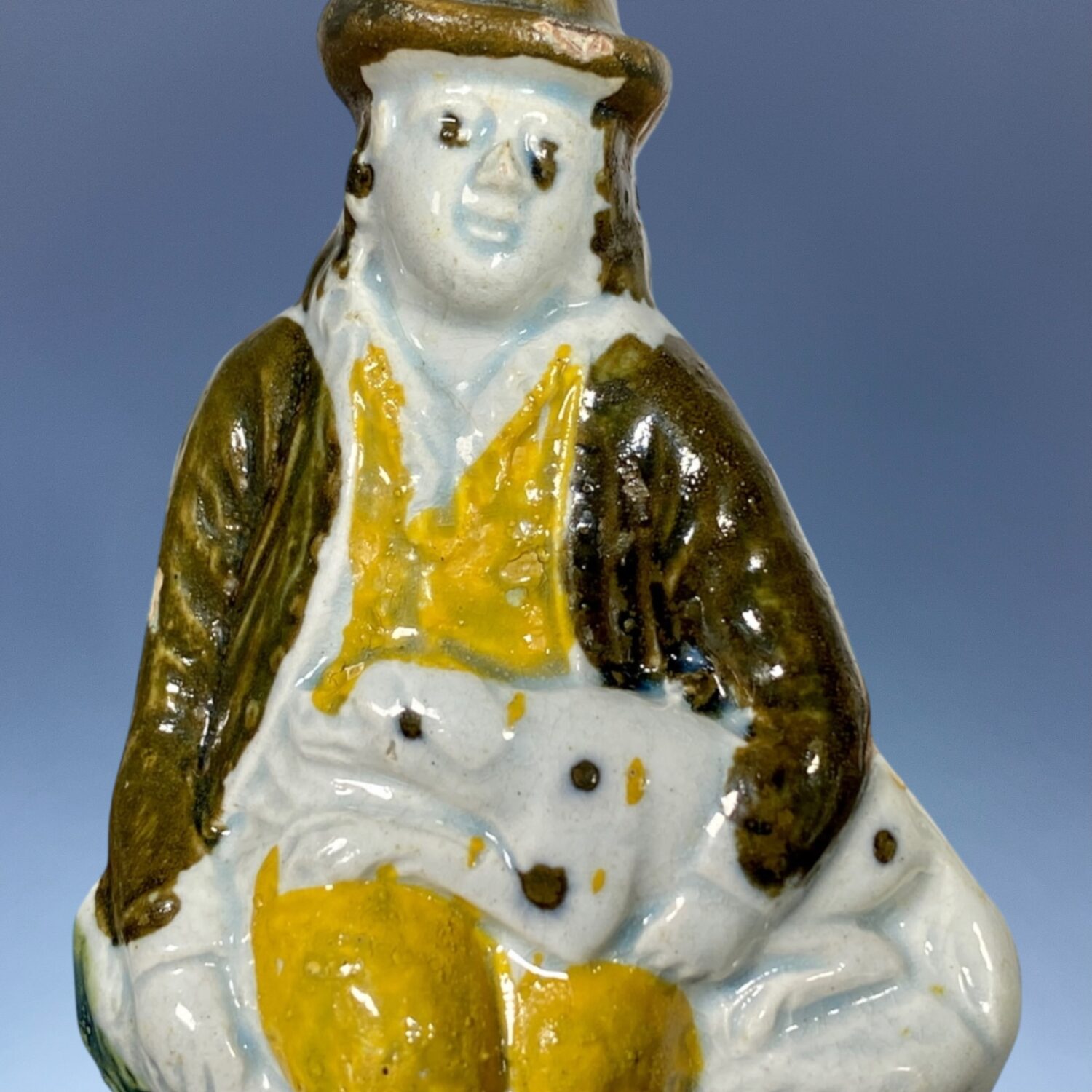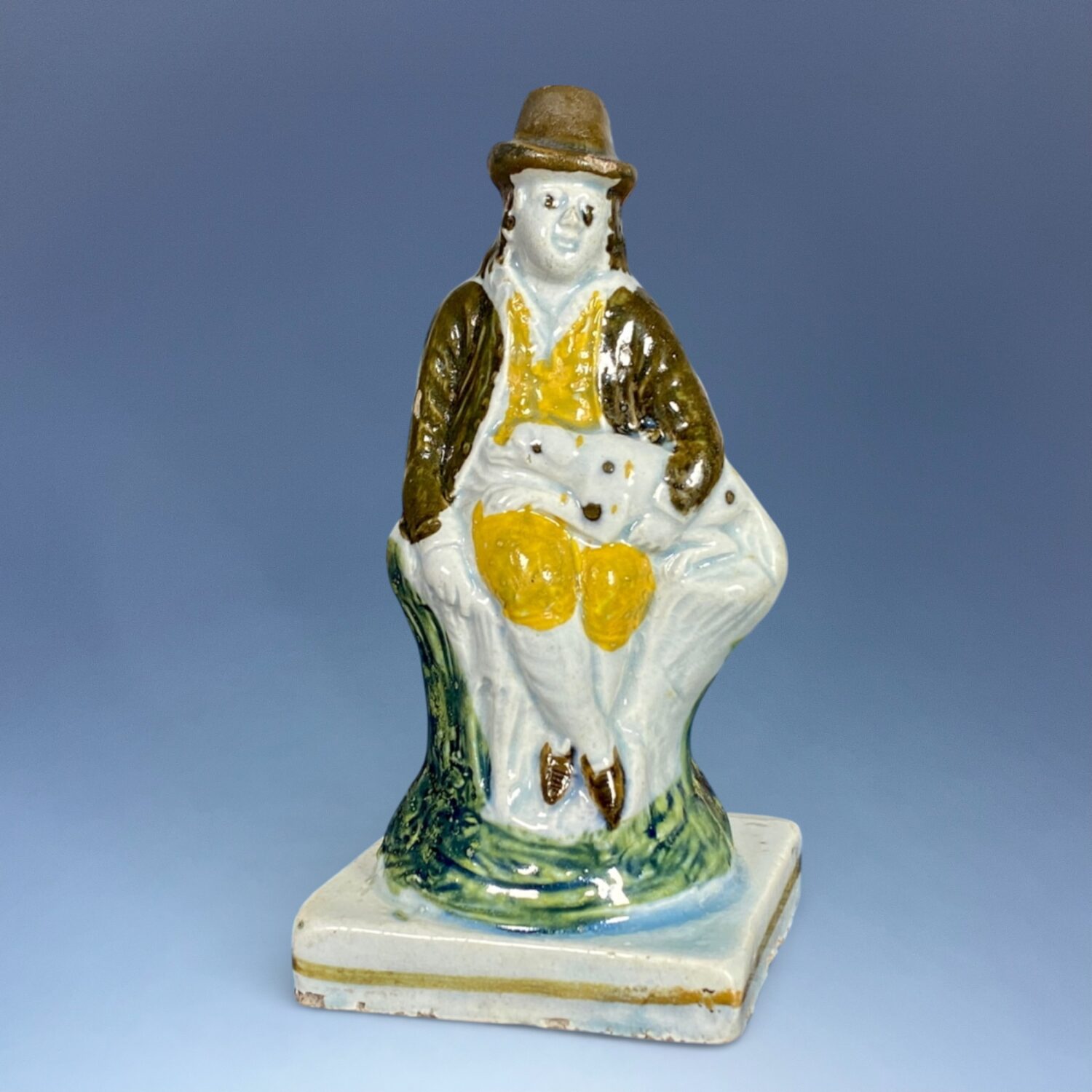Late 18th century English Prattware pottery small figure of a seated Gamekeeper with his dog lying across his lap.