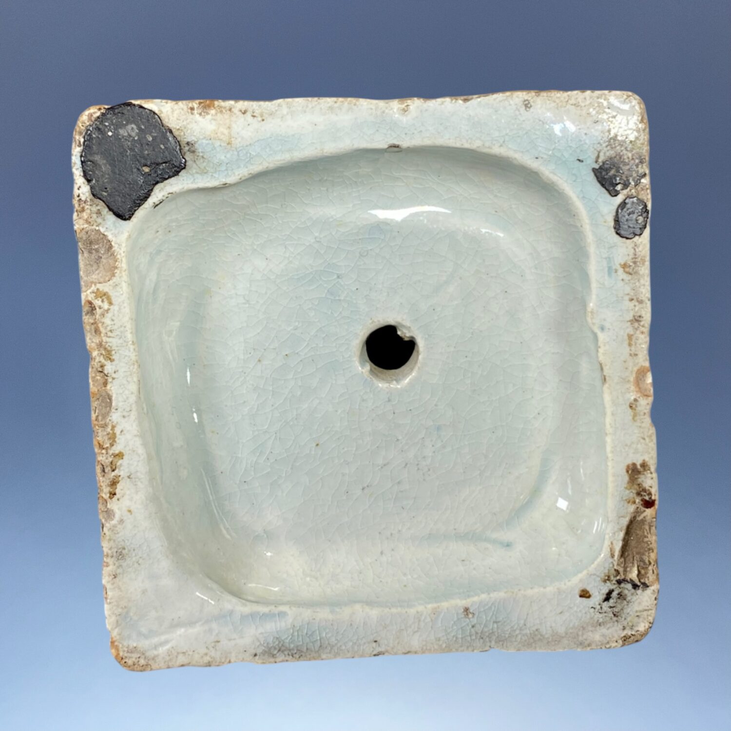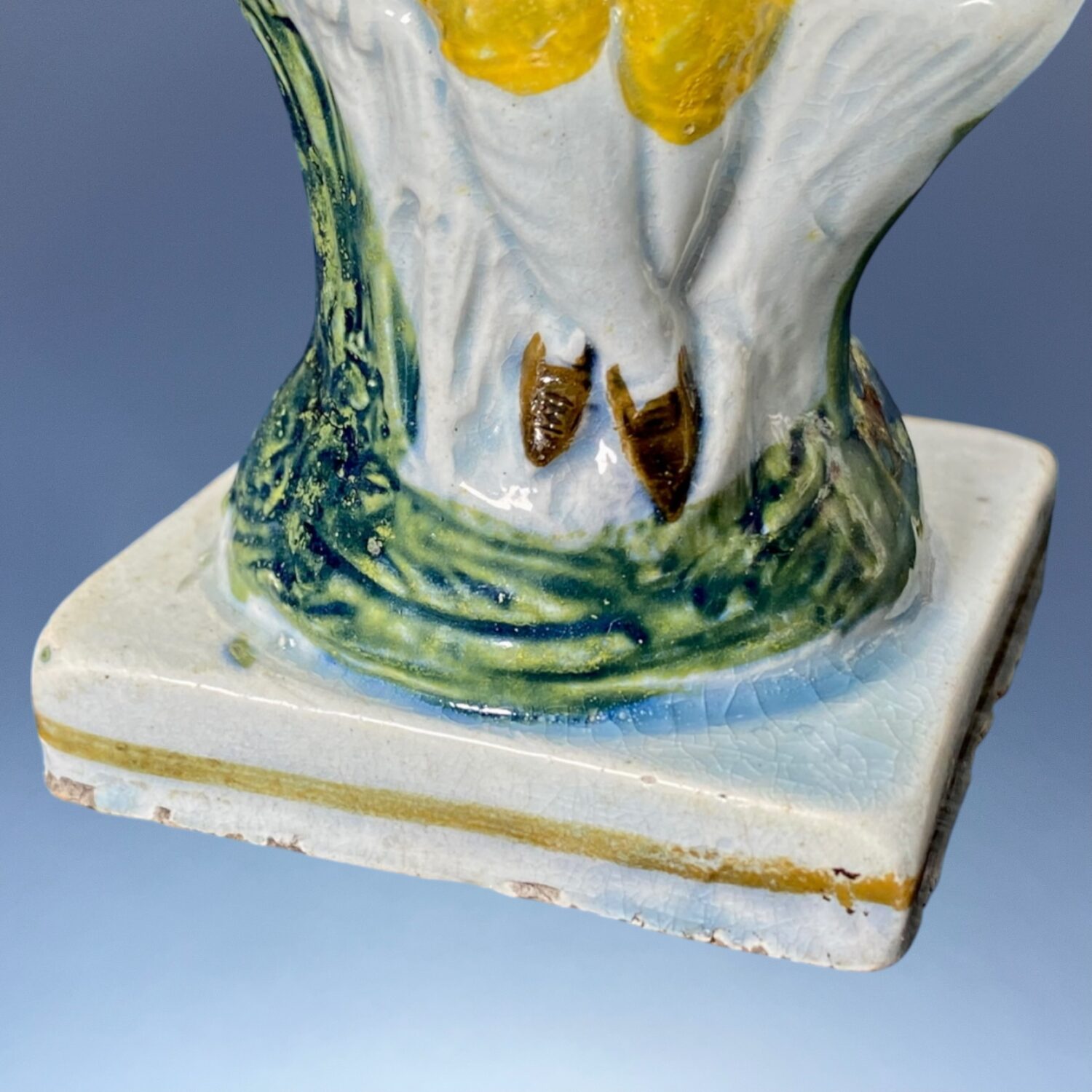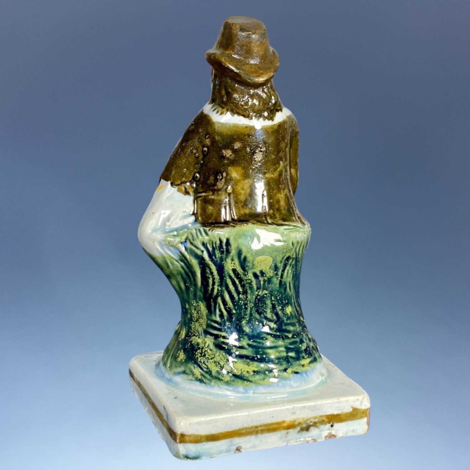 Late 18th century English Prattware pottery small figure of a seated Gamekeeper with his dog lying across his lap.