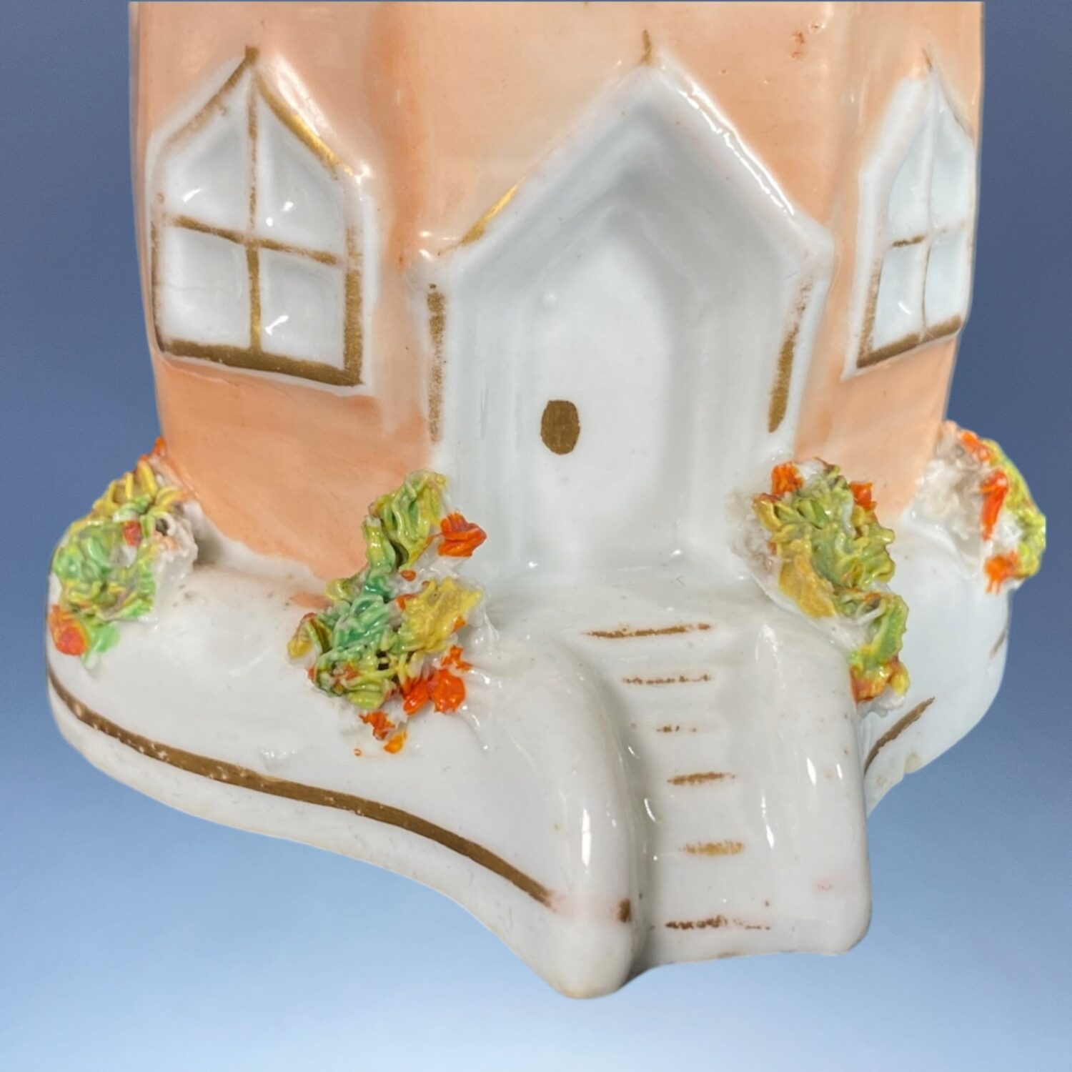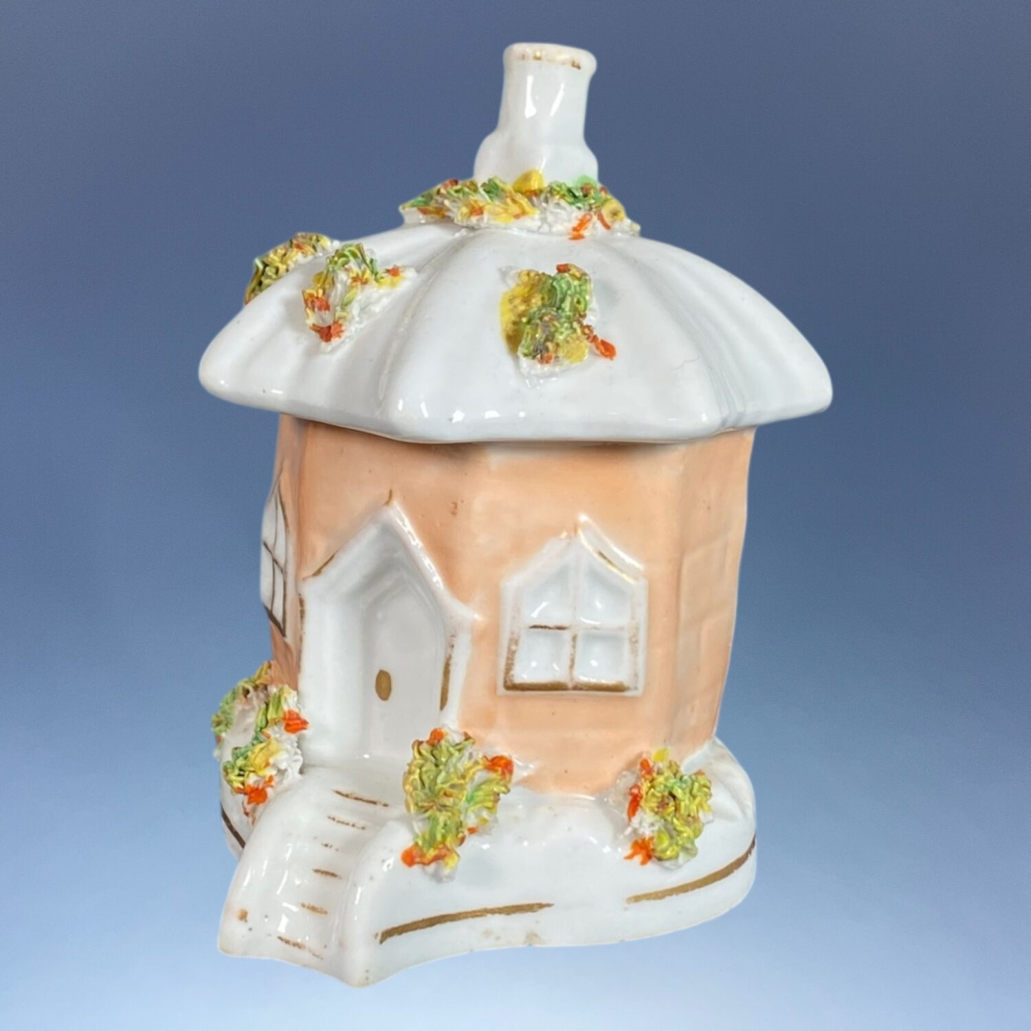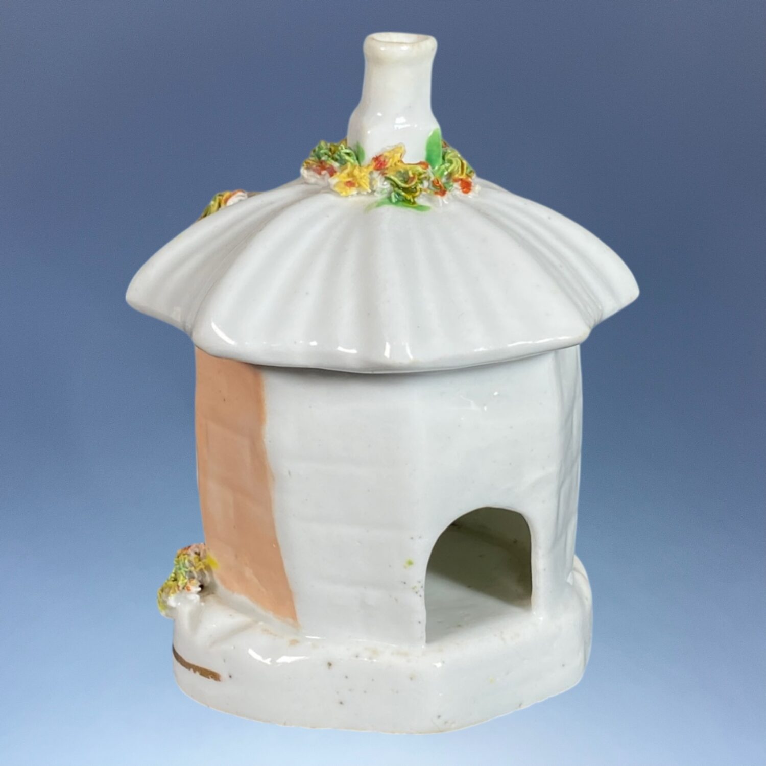 19th century Staffordshire porcelain small pastille burner in the form of an octagonal ‘Toll House’ cottage.
