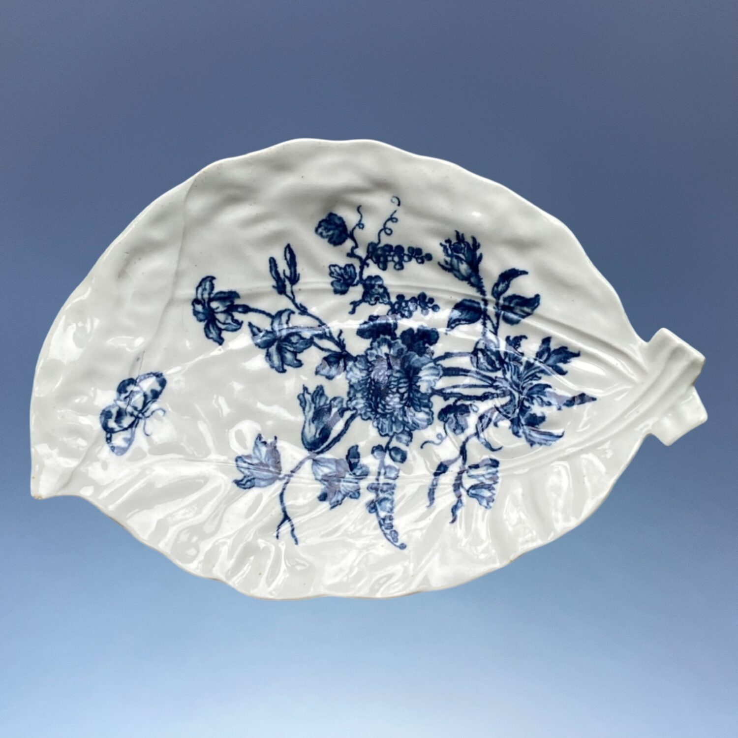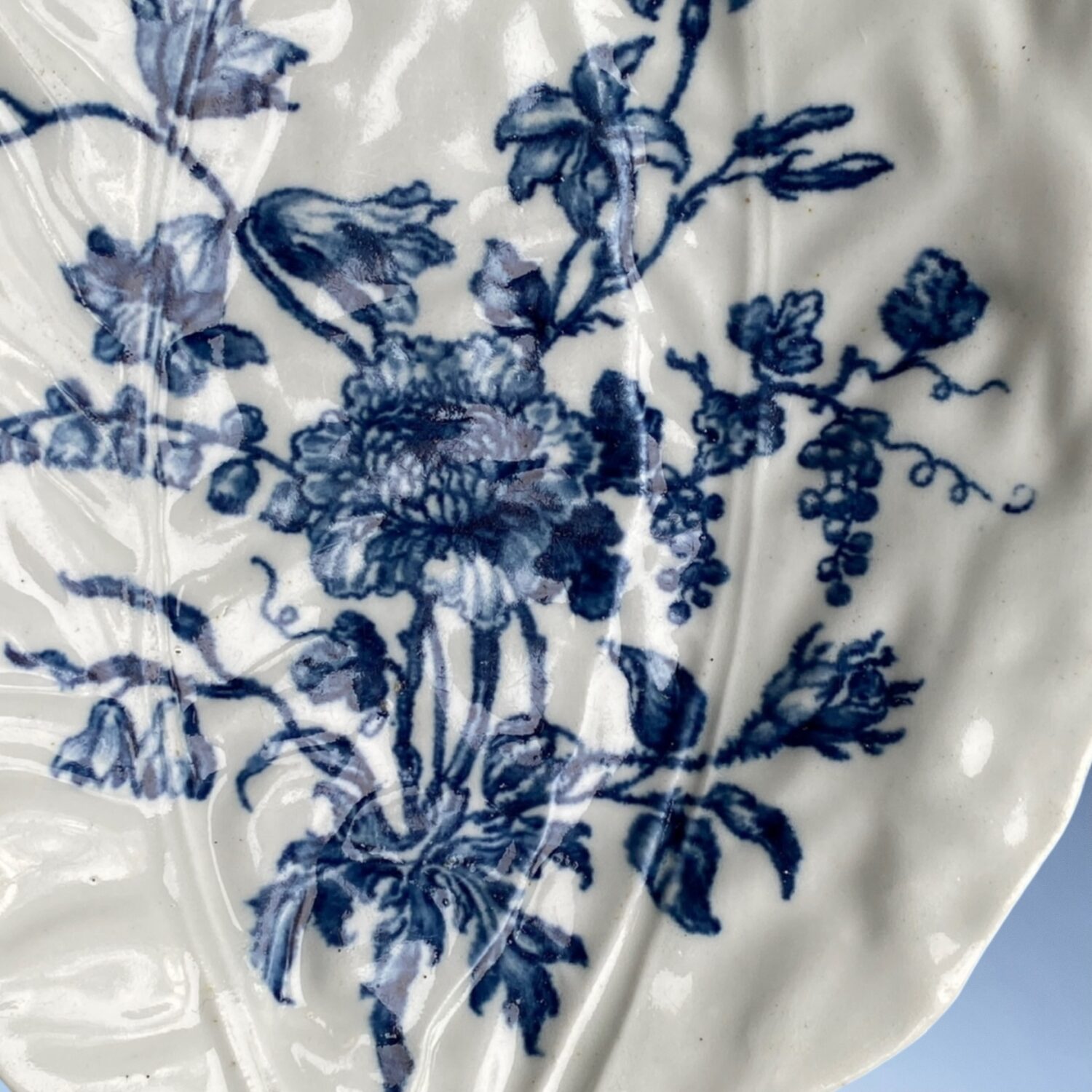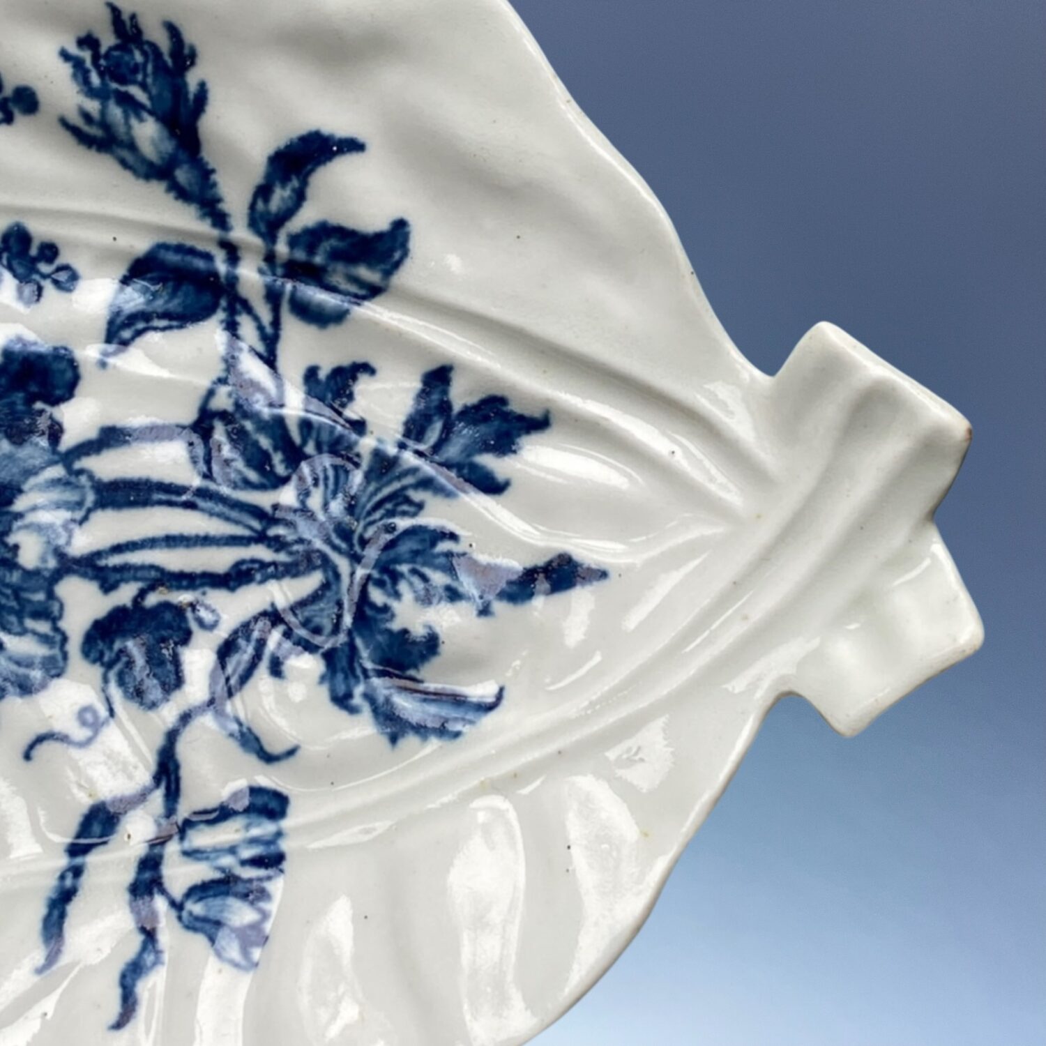 18th century Worcester Dr Wall or 1st period porcelain dish, moulded as two overlapping cabbage leaves, decorated with The Wispy Chrysanthemum Sprays pattern, printed in blue under the glaze.